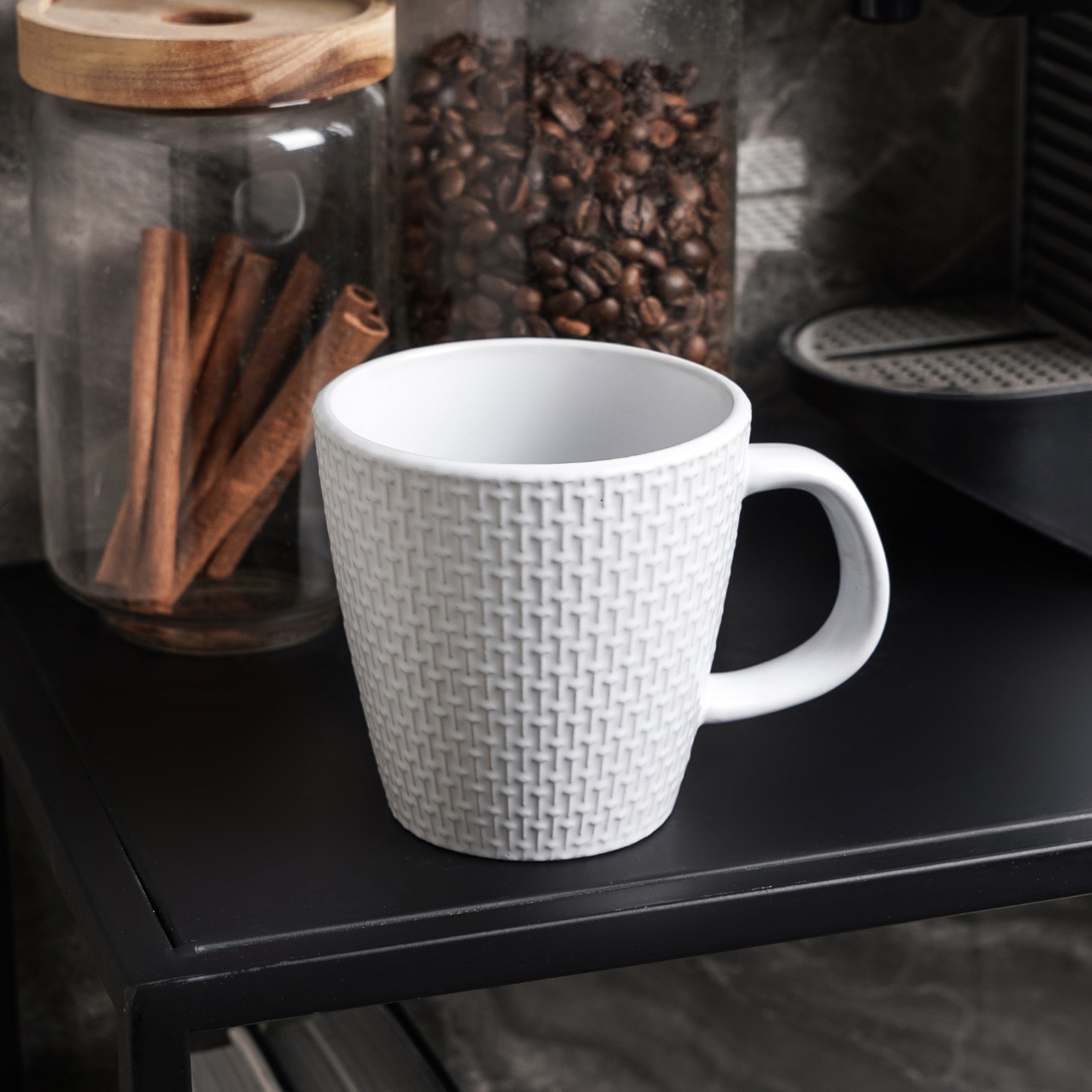 mercvo mercvoware Mug – Gray: High – Quality Ceramic Mug with Embossed Weave, Ergonomic Handle, and Stackable Design for Daily Beverage Use