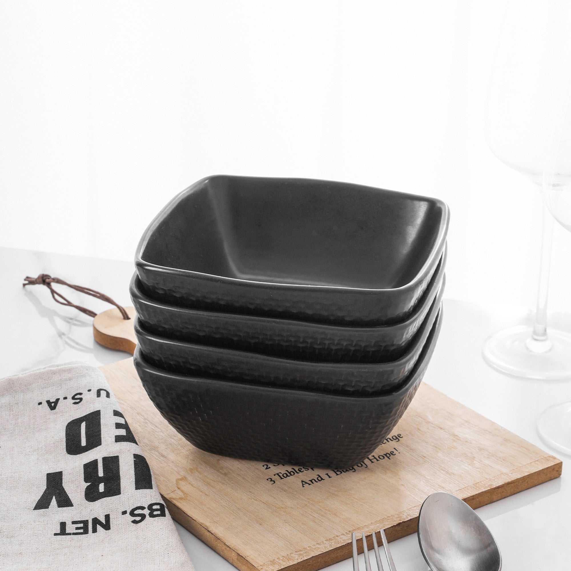 mercvo mercvoware Bowl – Black mercvo of 4 Square Ceramic Bowls with Embossed Weave Design, Dishwasher & Microwave Safe