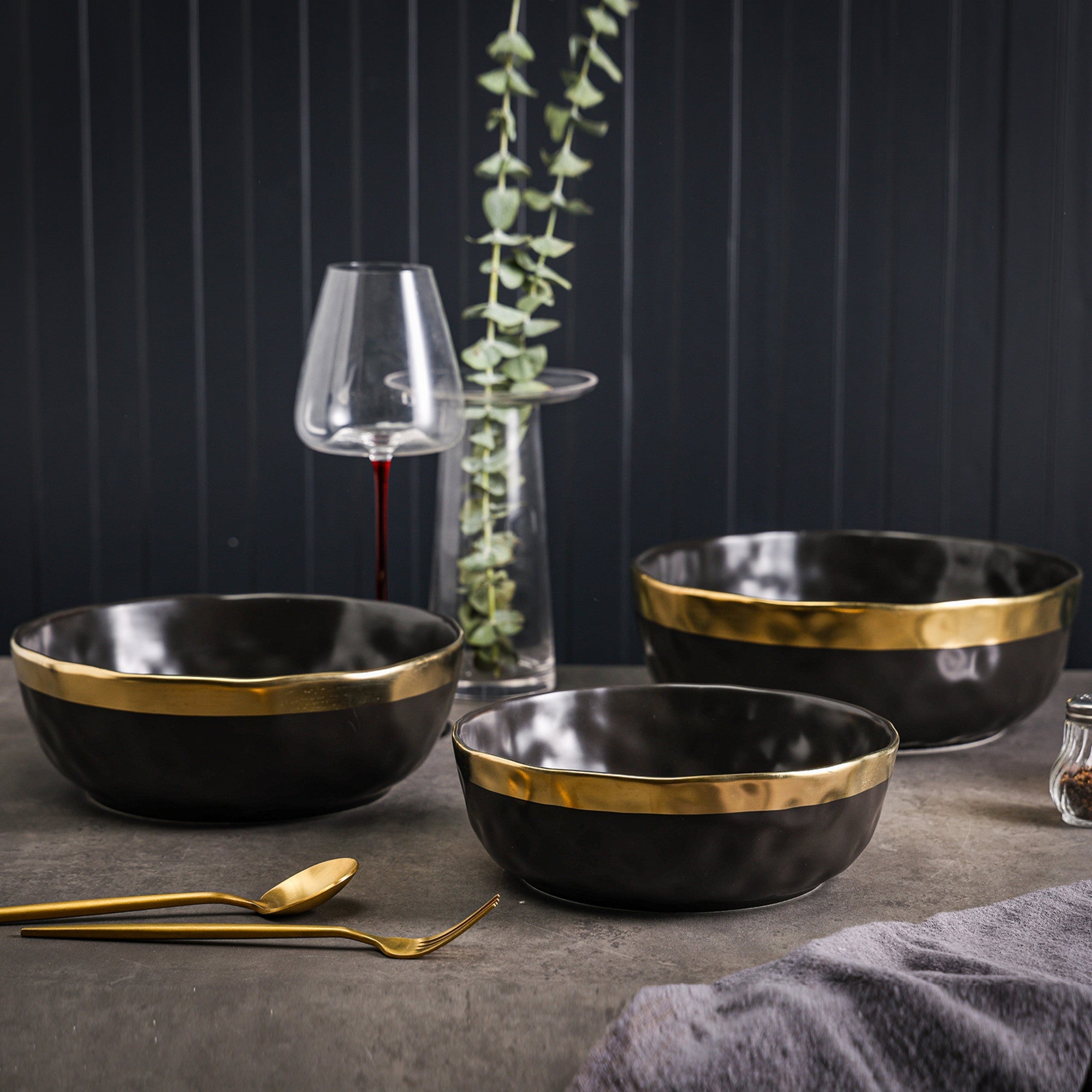 mercvo Porcelain Service Bowl mercvo – Black #2: Three – Size Ceramic Bowls with Gold Trim, Stackable & Versatile for Any Dining Occasion