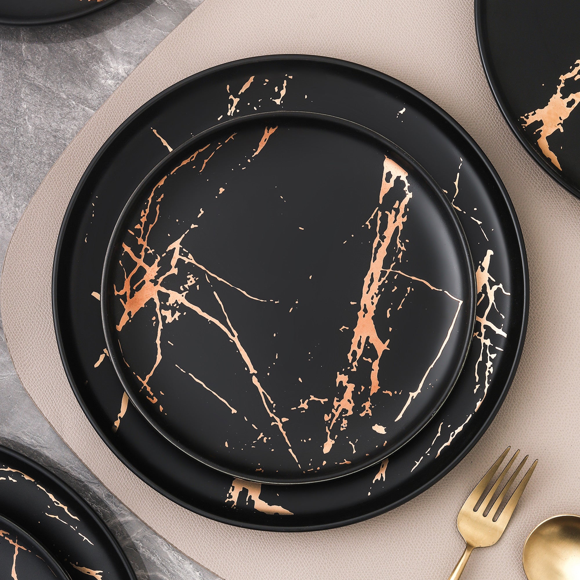 mercvo Porcelain Dinner Plate – Black mercvo of 4 with Unique Gold Marbling for Stylish Dining