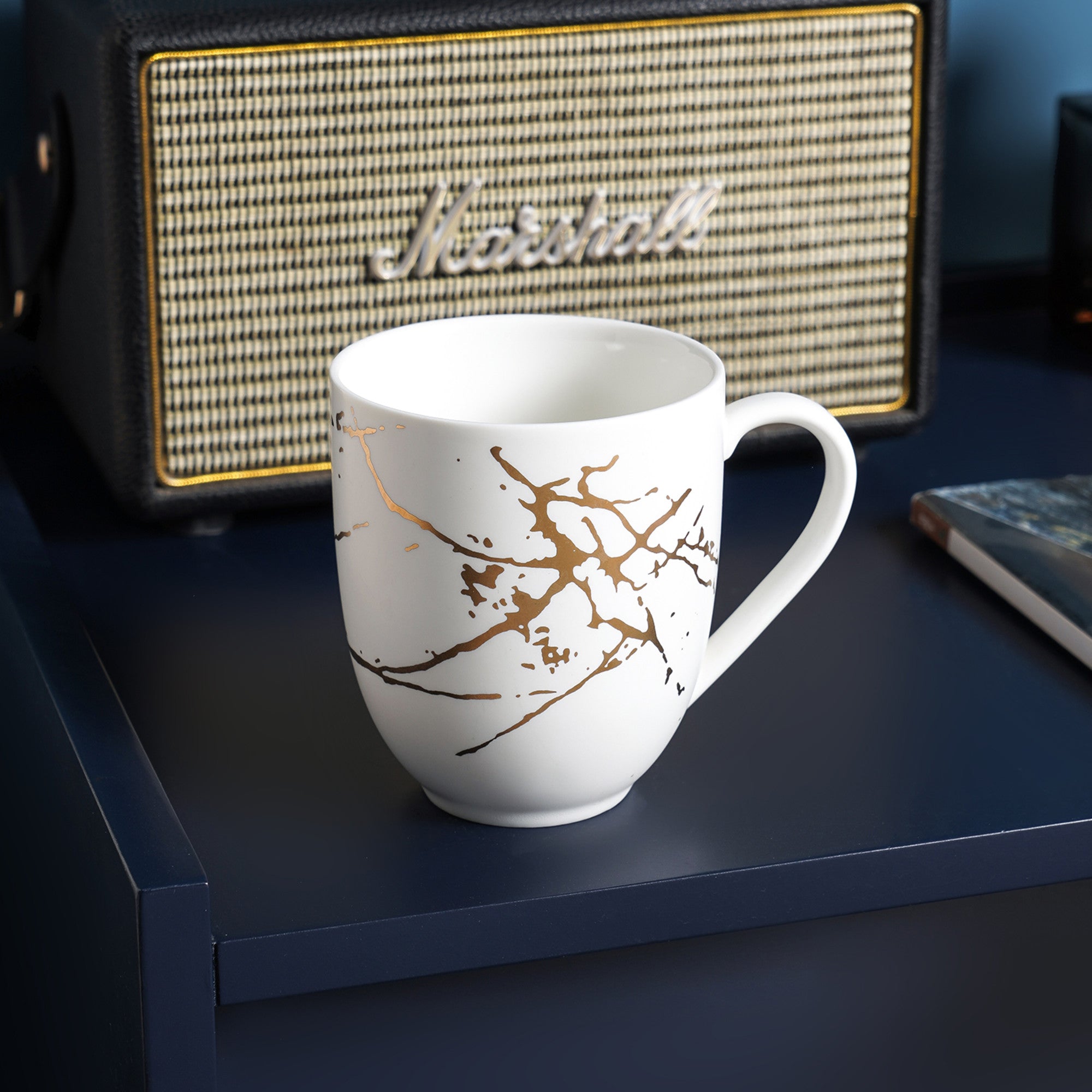 mercvo Porcelain Mug – White mercvo of 4 with Gold Abstract Design, 12 – 16 oz, Dishwasher Safe for Home and Office Use