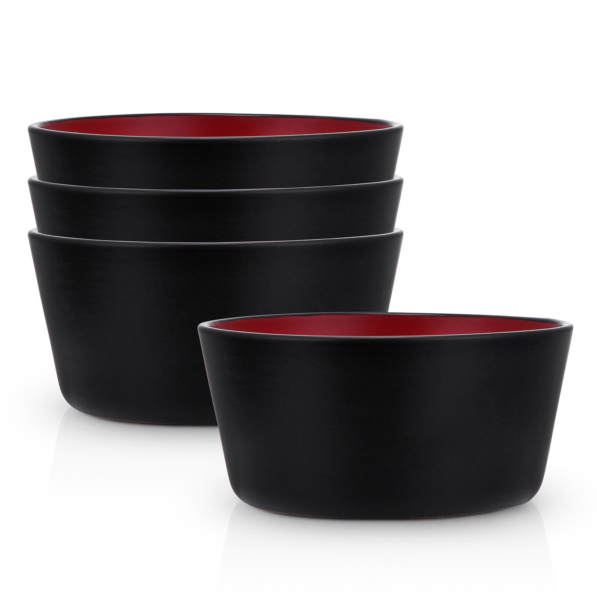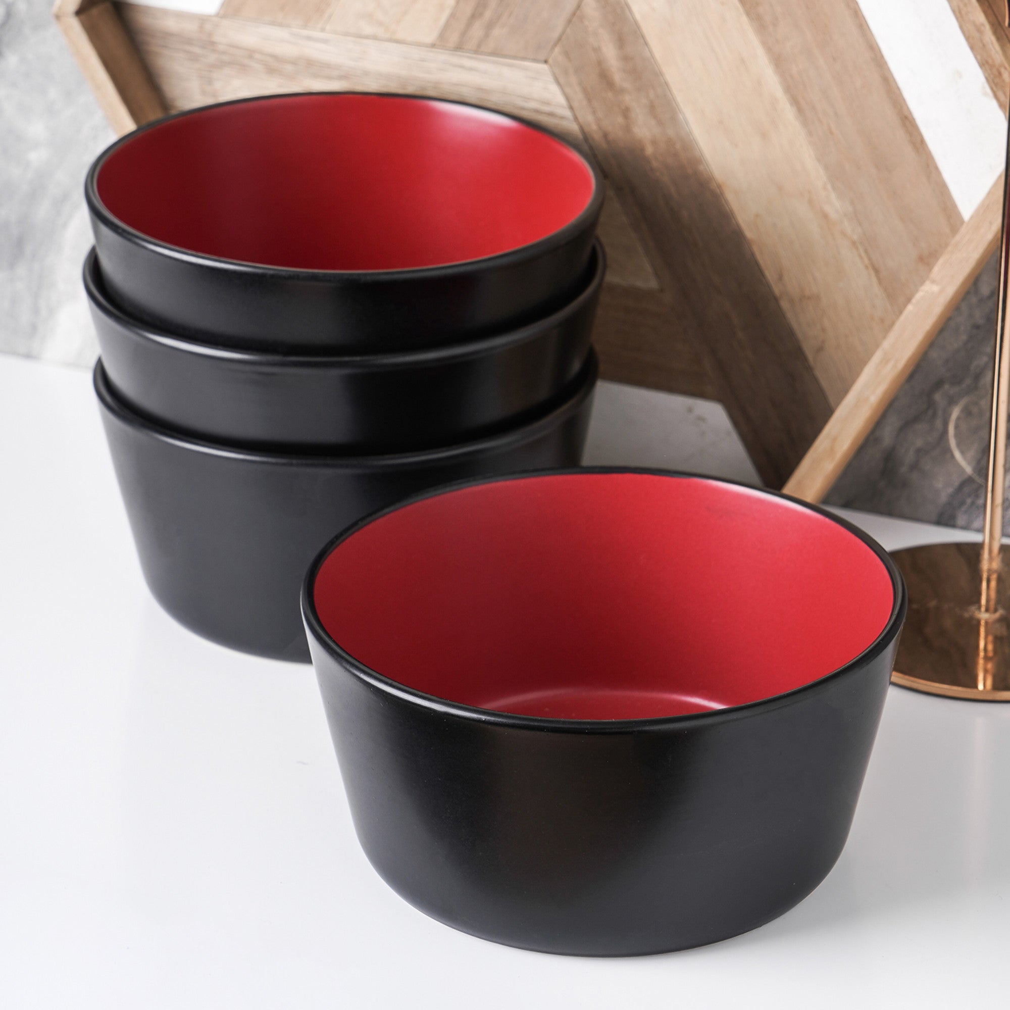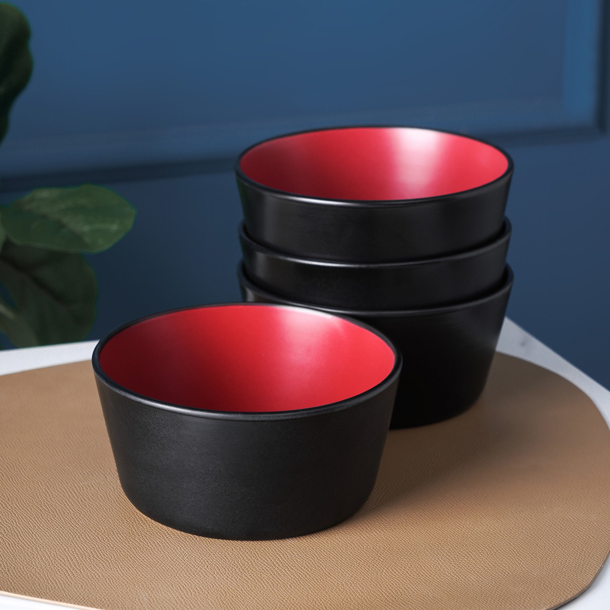 The set includes 4 large round 5.75” bowls, expertly crafted and artfully designed. The bowls are made of ceramic or stoneware, which are known for their durability, heat resistance, and ease of cleaning. The exterior of the bowls features a solid matte black finish that resists fingerprints and scratches, while the interior is a solid glossy red, creating a high – contrast visual appeal that makes your dishes pop.