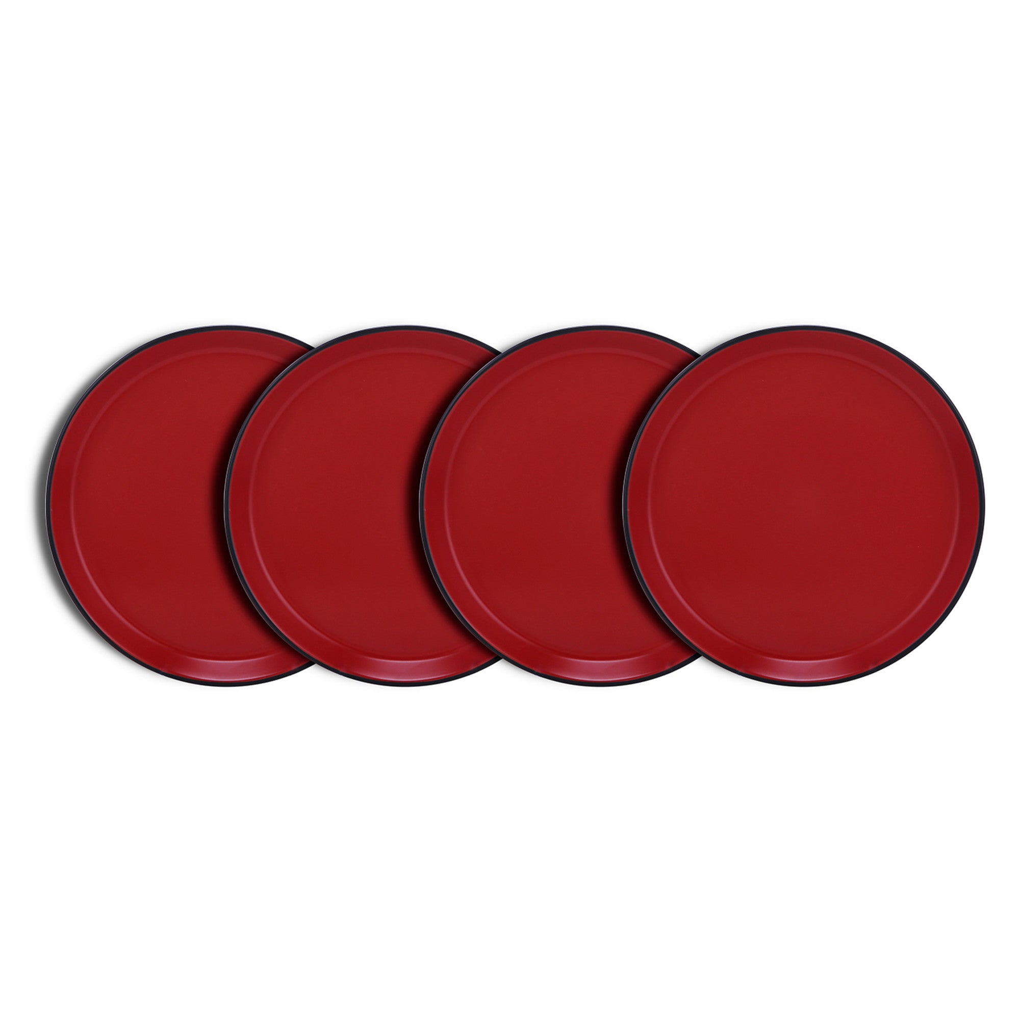 The set includes 4 large round salad plates, each with a diameter of approximately 10 – 12 inches. The plates have a thin profile, making them ideal for everyday use or light meals. The rich red interior, with a smooth and glossy finish, provides a vibrant backdrop for your delicious dishes, while the thin black outer rim adds a striking contrast and visual definition.