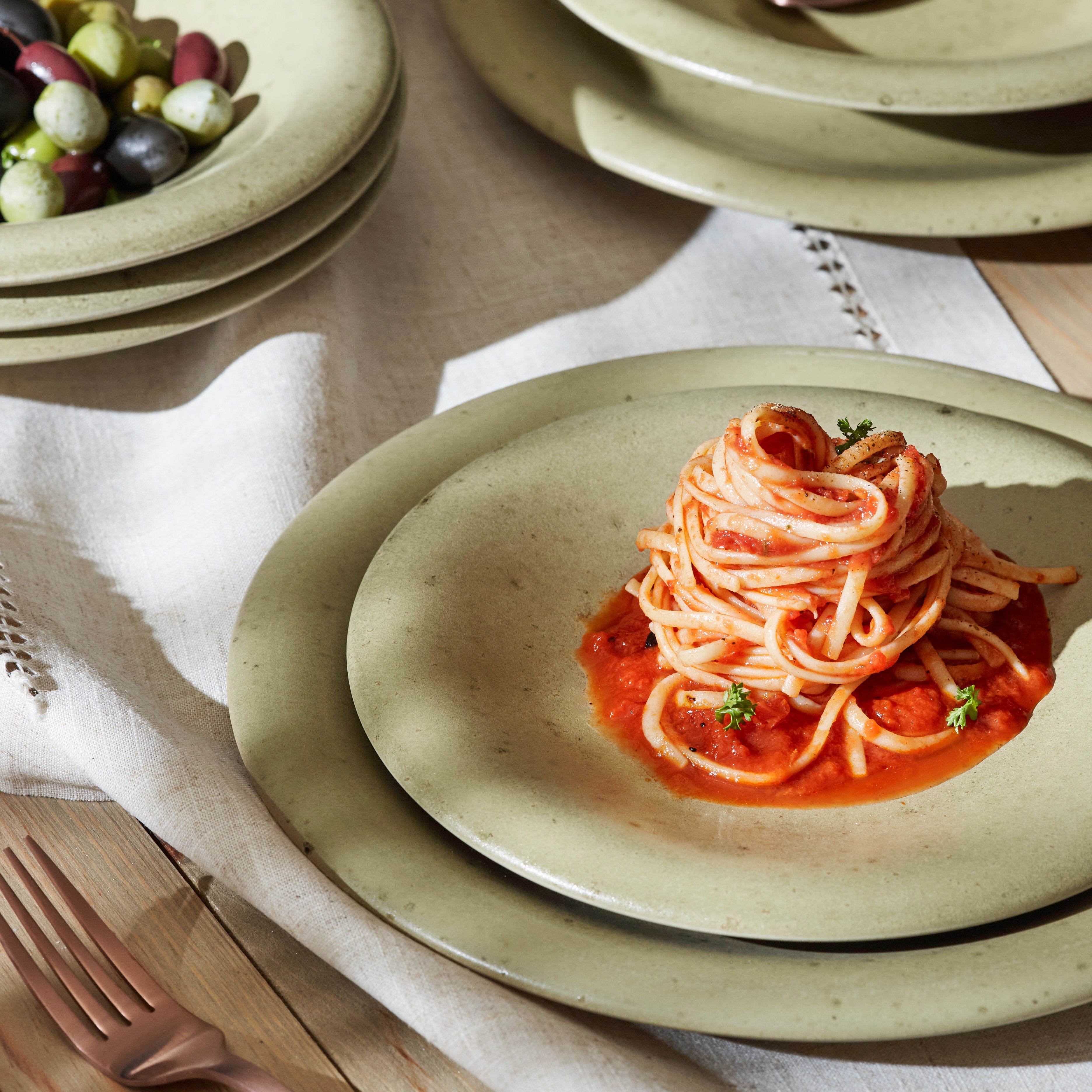 Pair this dinnerware set with wooden tables, linen napkins, and copper – toned utensils for a complete rustic look. It’s perfect for serving a variety of cuisines, from Italian pasta to fresh greens and olives.