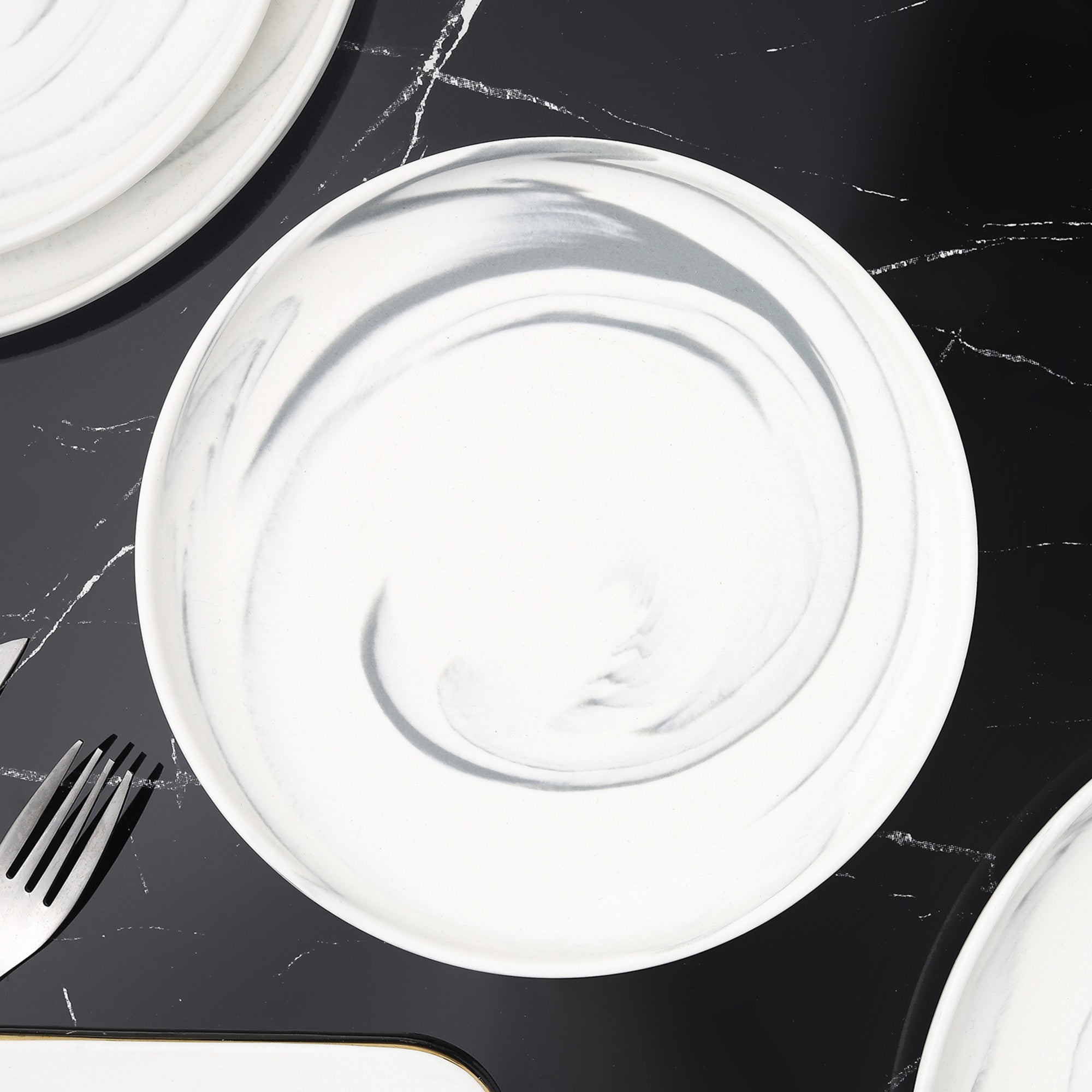 Crafted from high – quality porcelain, these plates feature a smooth, glossy finish and a durable, non – porous surface that is ideal for food contact. The primary color of the plates is white, adorned with a beautiful gray (or light blue – gray) marbling pattern. Each plate has unique, handcrafted – like swirls, mimicking the organic beauty of natural marble and adding an artisanal touch to your dinnerware collection.