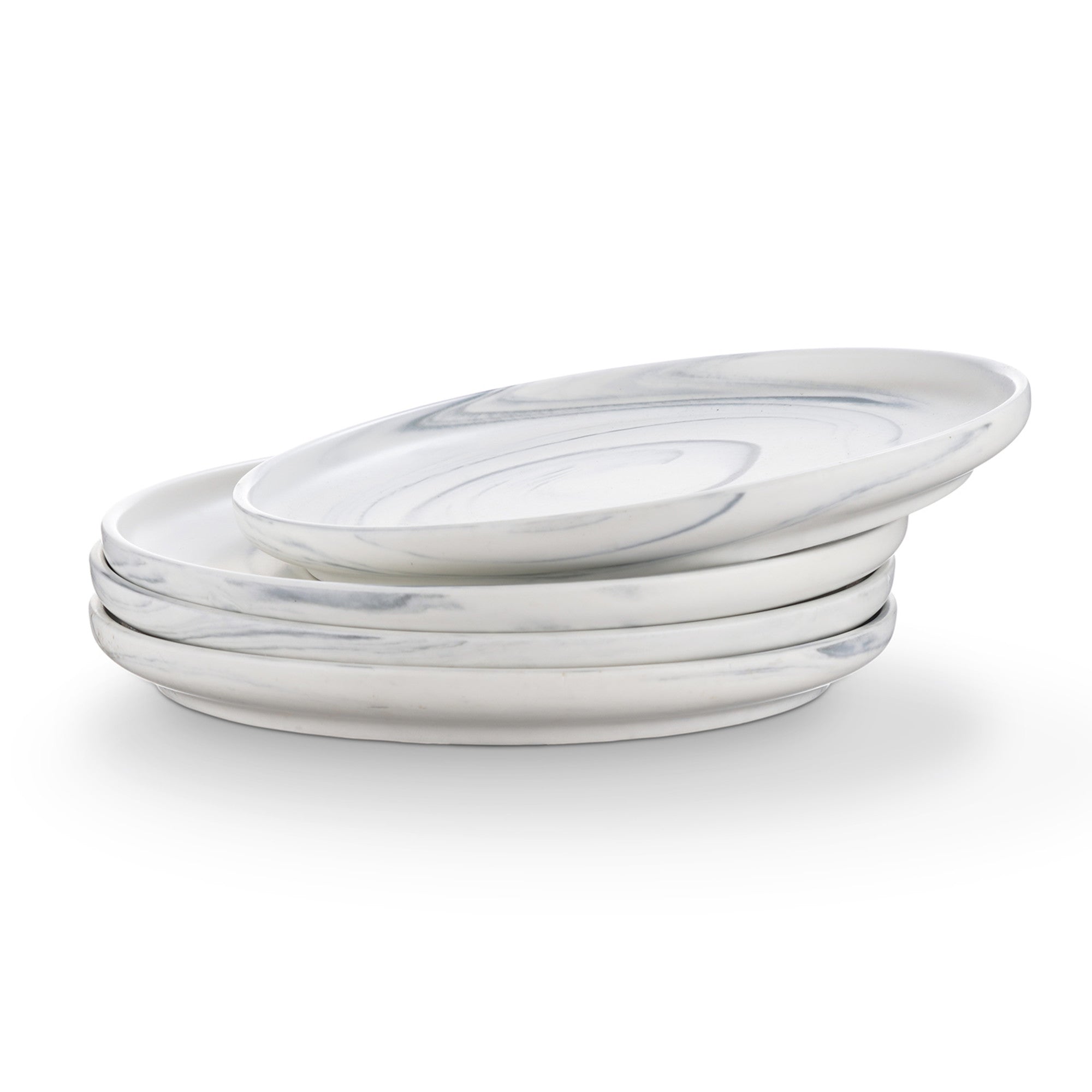 Another great feature of these plates is their stackability. As shown in the images, they can be neatly stacked, allowing for space – efficient storage. The high – quality manufacturing is evident in the even marbling, smooth edges, and uniform finish. The glossy, scratch – resistant surface makes them ideal for daily use and easy to keep clean.