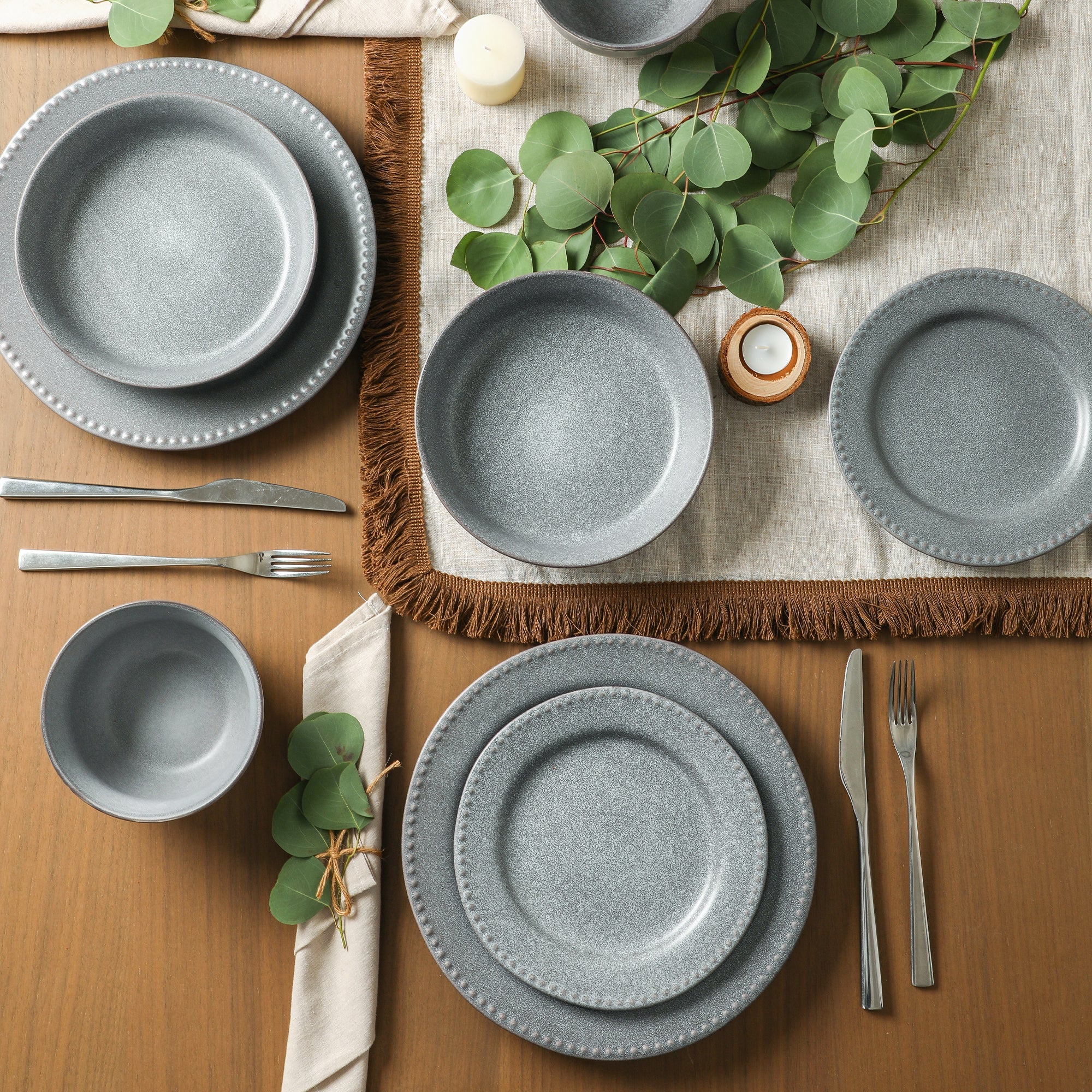 The consistent, muted gray color with a subtle speckled and textured surface gives the set a rustic, natural aesthetic. All plates, bowls, and likely matching utensils share a delicate beaded rim pattern, which is a uniform raised – dot design along the edges, adding visual interest without being overly ornate. This not only enhances the set’s visual appeal but also ensures a cohesive look.
