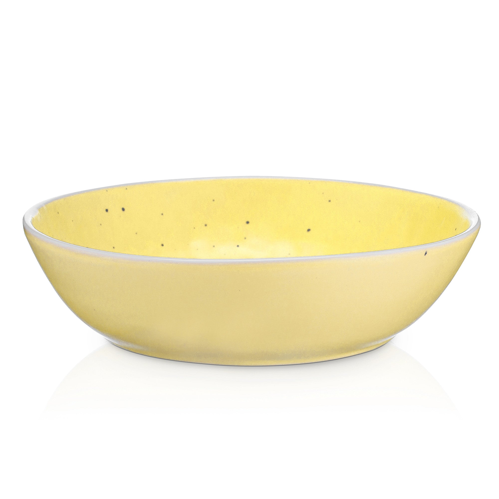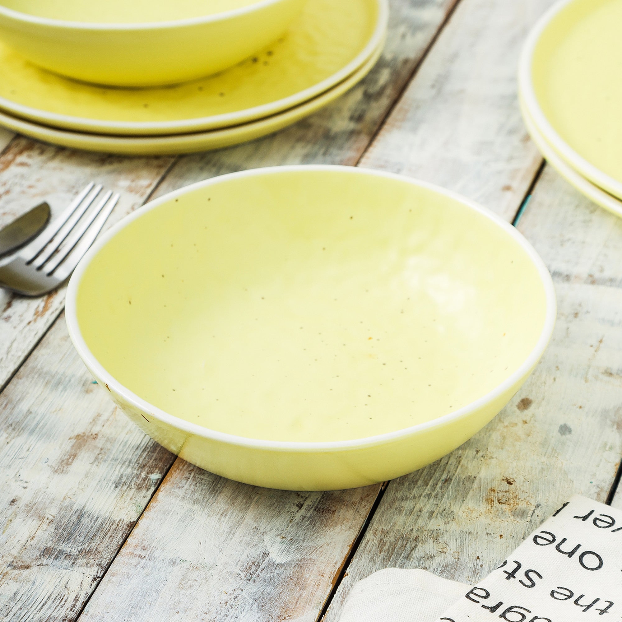 The bright, pale yellow (lemon yellow) exterior of the bowls is solid and even, creating a cheerful and inviting look. The interior features a unique rustic touch with subtle, scattered dark specks (black/brown), adding a vintage charm. The white (or off – white) contrasting rim not only adds visual clarity but also gives the bowls a polished finish.