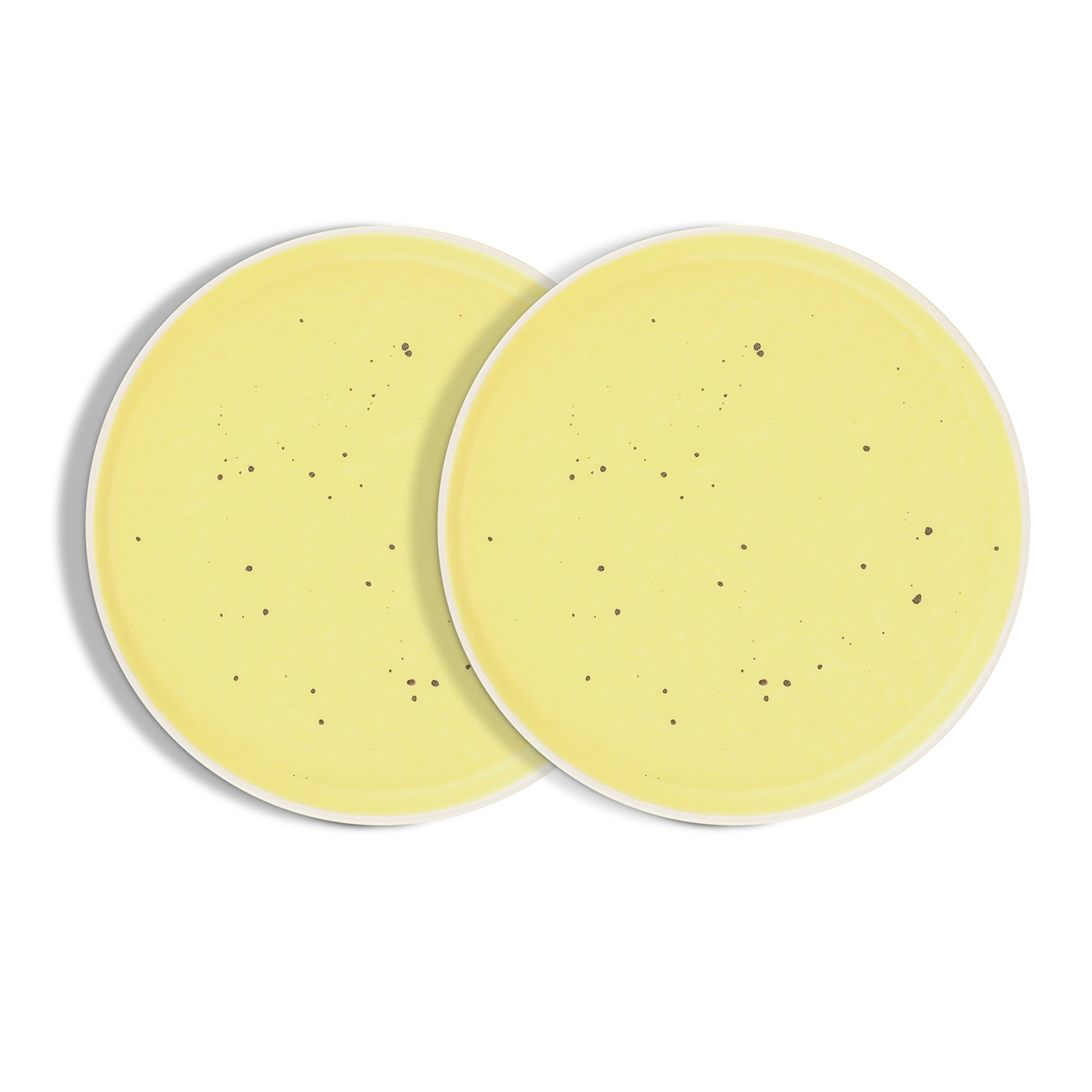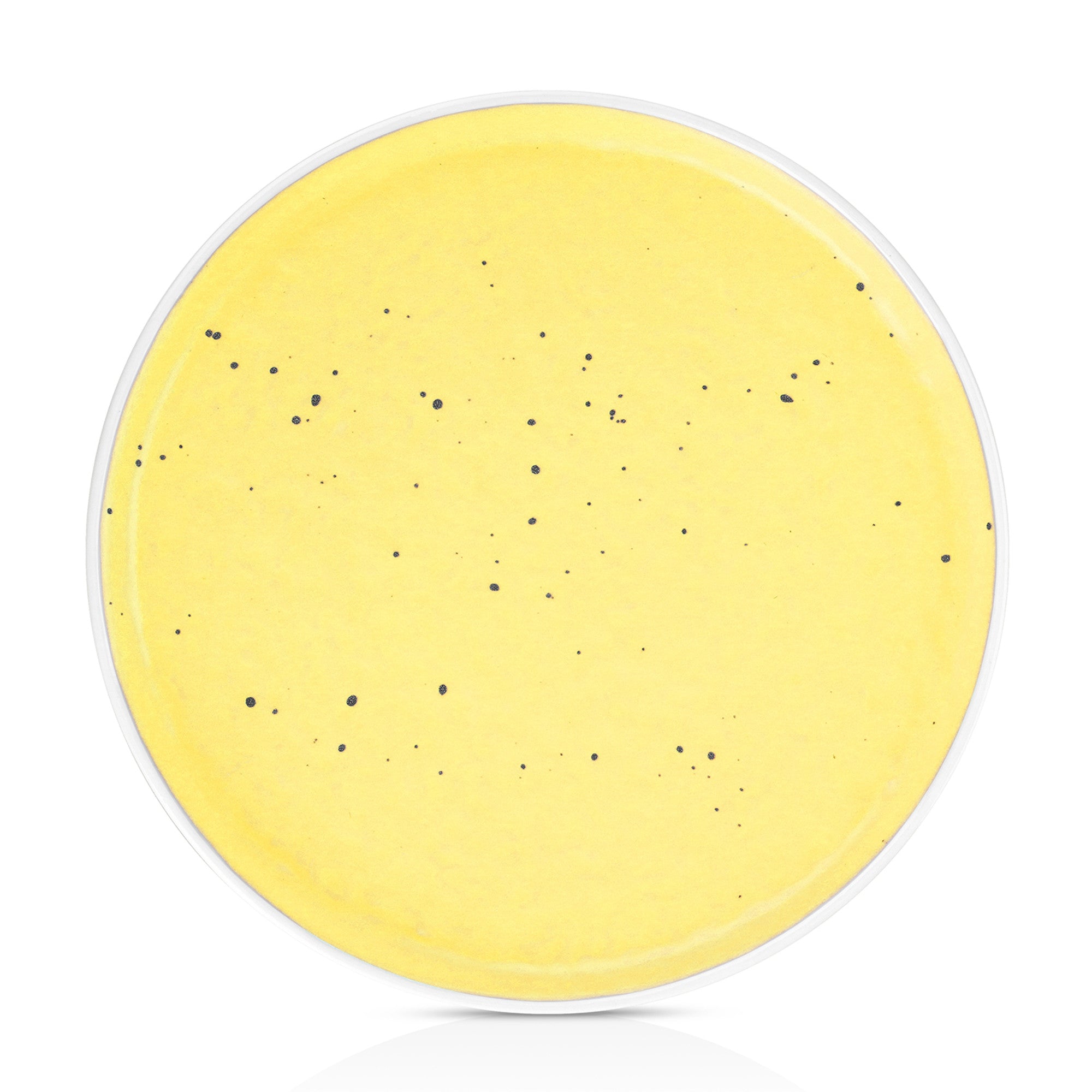 The set includes 4 ceramic plates, crafted from high – quality ceramic or porcelain, which is evident from their smooth, glossy finish and uniform thickness. Each plate features a subtle speckled design with small dark dots scattered across the yellow surface, giving it a rustic, artisanal look. The white outer rim creates a clean contrast with the yellow body, adding a polished and finished appearance.