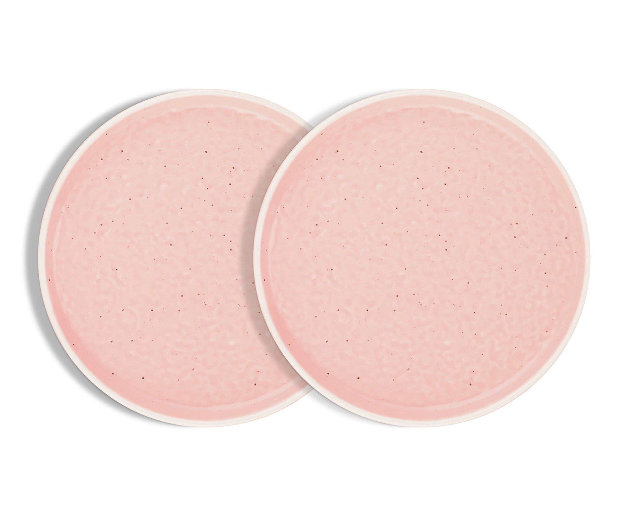 The plates are crafted from high – quality ceramic (stoneware), known for its durability, heat resistance, and food – safe properties. The smooth, glossy outer rim in a clean, neutral white or off – white color contrasts beautifully with the soft, muted pink (blush/dusty rose) base. The interior of the plates features a subtle, irregular speckled texture with small dark (black or charcoal) specks, adding both visual interest and a unique tactile quality. This textured interior also helps prevent food from sliding, making it perfect for serving all your favorite dishes.