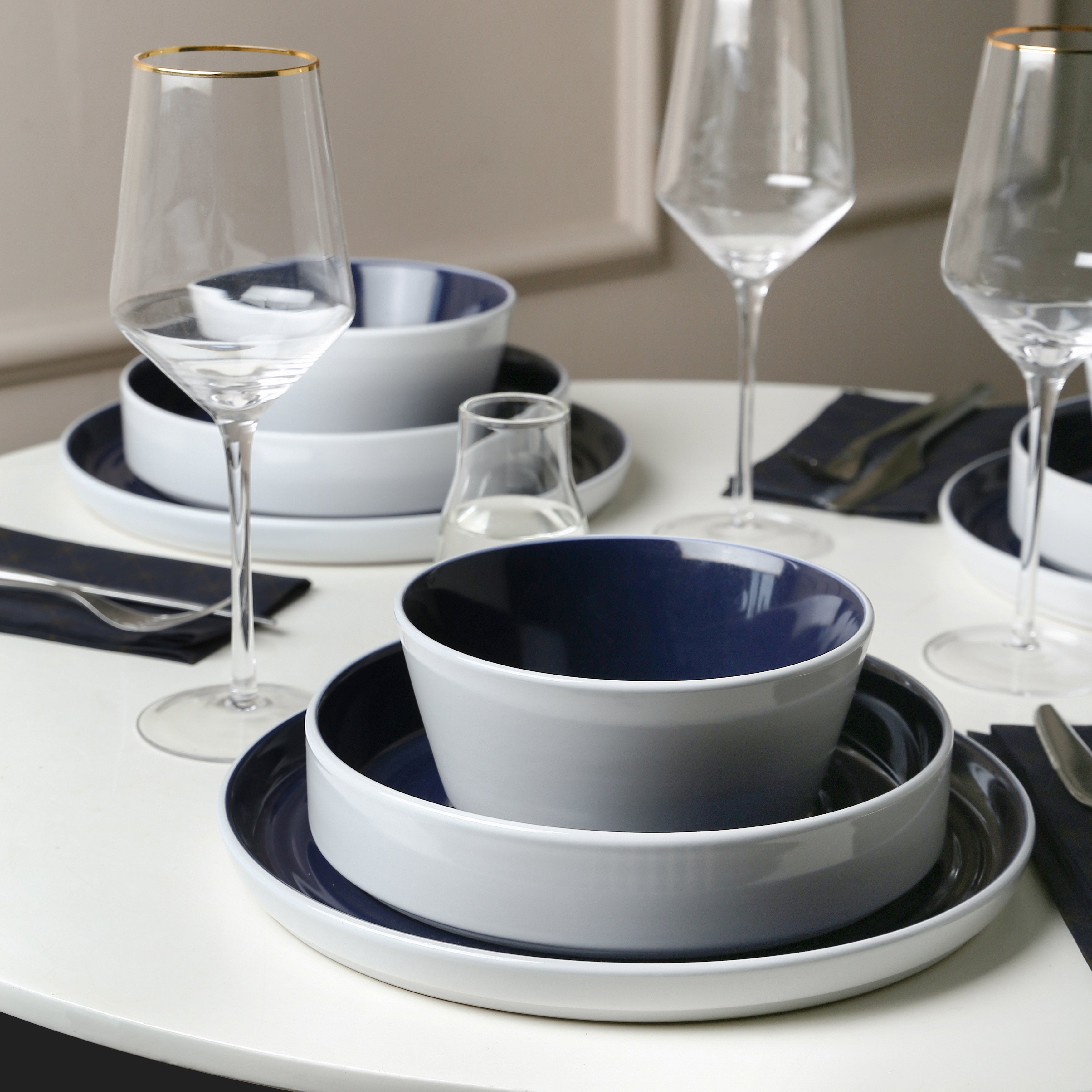 Crafted from high – quality ceramic (or porcelain), this dinnerware set offers a smooth, glossy finish that not only looks premium but is also incredibly easy to clean. The two – tone color scheme, with a predominantly white exterior and a deep navy blue interior, creates a modern and minimalist aesthetic that makes your food stand out.