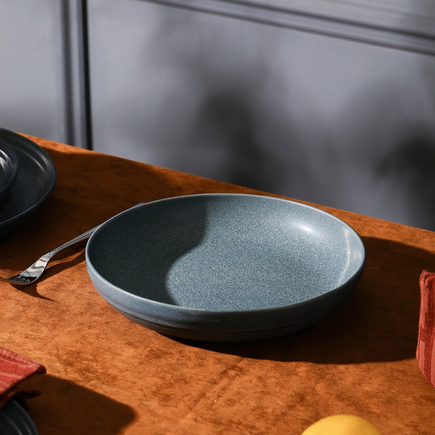 The dishware is crafted from high – quality ceramic stoneware. Its muted blue – gray (teal/charcoal – blue) color with a speckled pattern of small white/lighter gray specks creates a unique, handcrafted look with a fine texture, adding visual interest to your table settings. The outer rim in a darker shade of the same blue – gray provides a subtle contrast to the lighter interior.