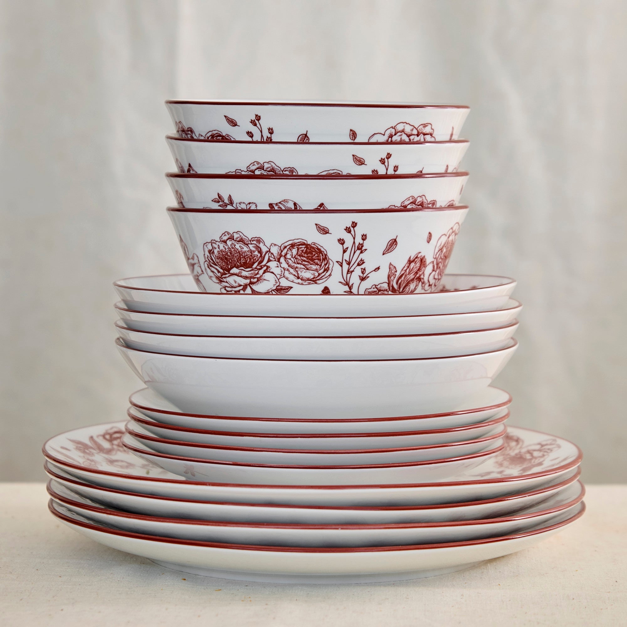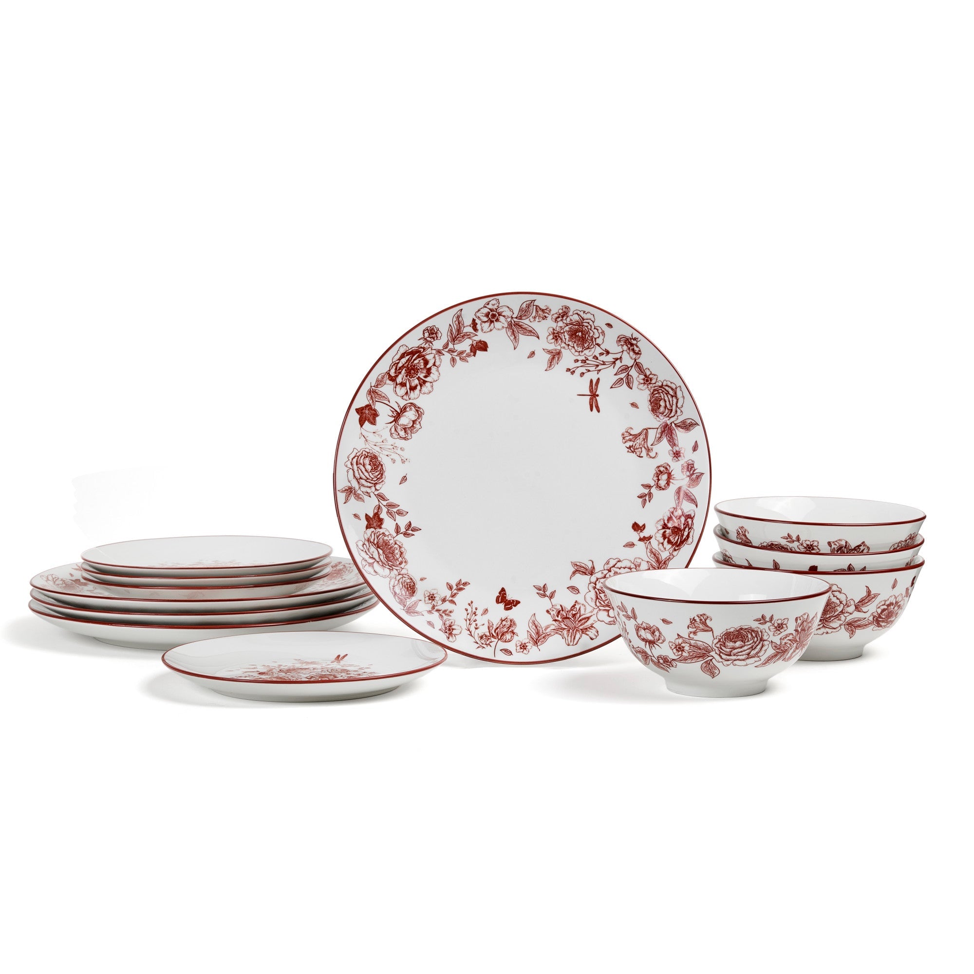 | Color & Design | White base with rich red (burgundy/maroon) floral pattern; intricate botanical designs with roses, flowers, leaves, butterflies, dragonflies; thin red rim on all pieces; classic, elegant, and slightly whimsical style |