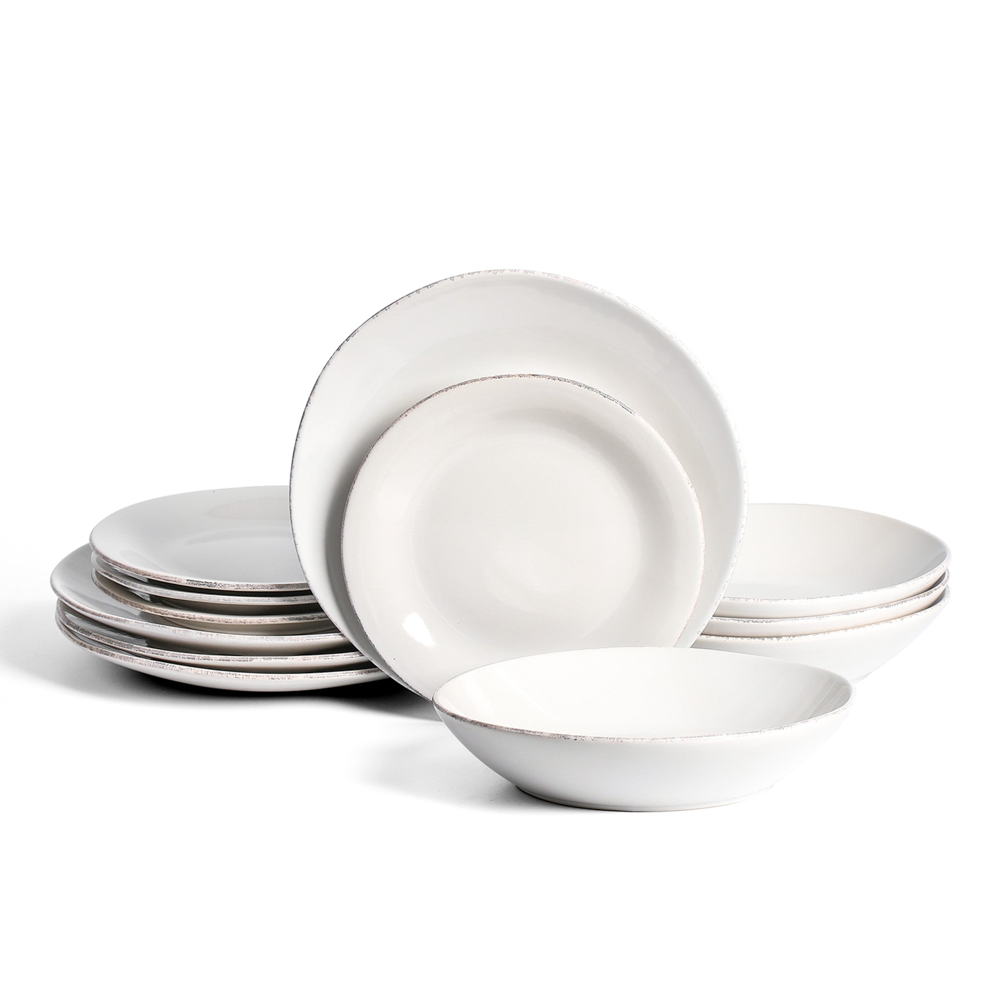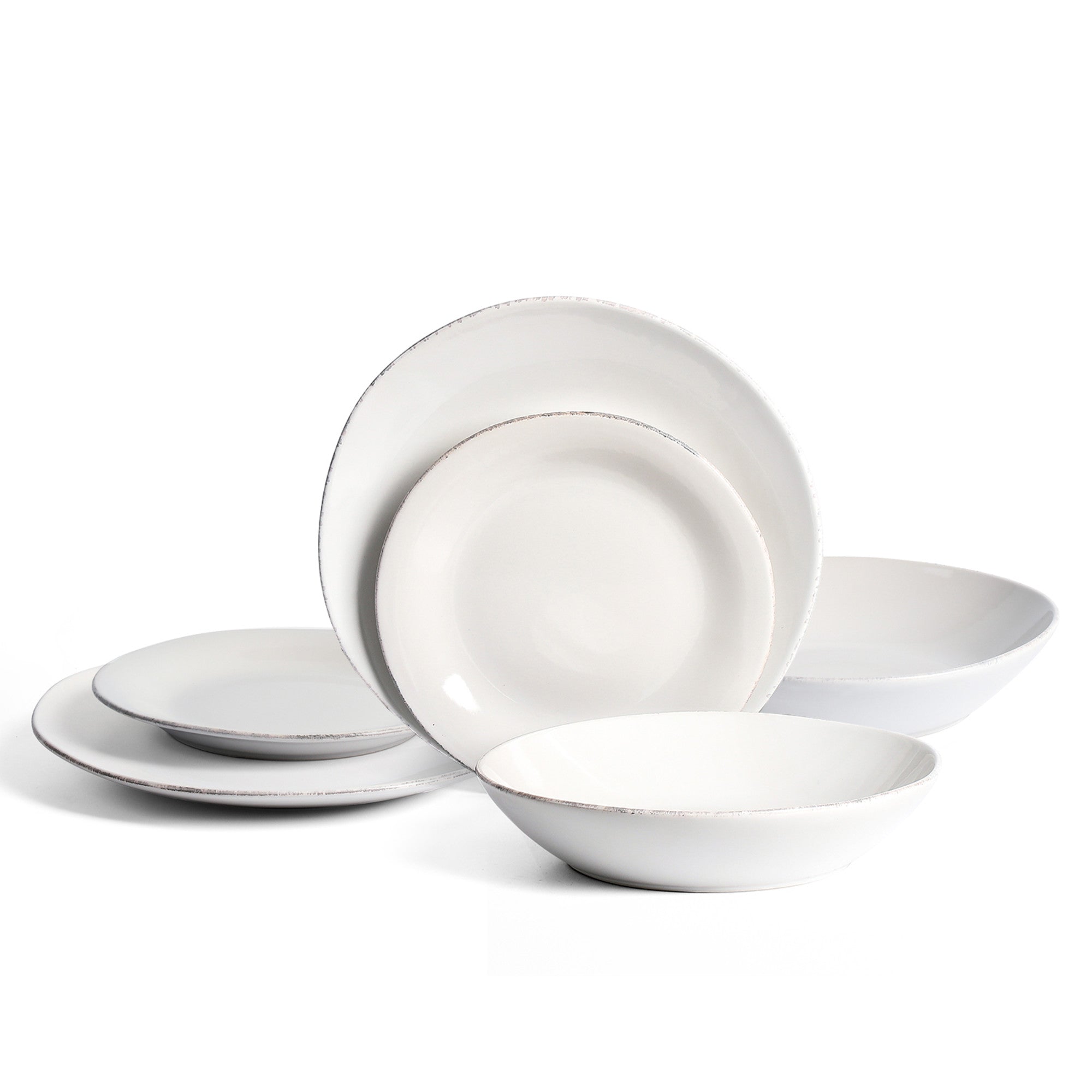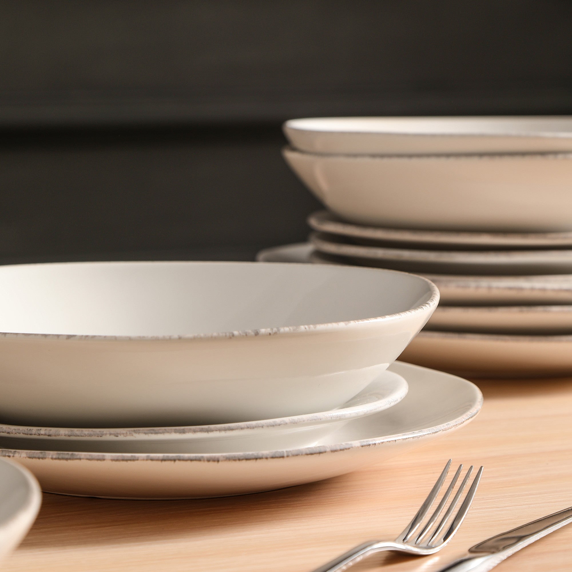 The dinnerware set consists of ceramic plates and bowls, designed for tabletop use in home dining. The primary material is ceramic, evident from its smooth, glossy white surface and reflective finish. The distressed rim details, a light gray or brown uneven edge, add a rustic, vintage aesthetic while maintaining sturdiness. With a monochromatic design focused on the white base and distressed rim, it offers a clean, minimalist look.