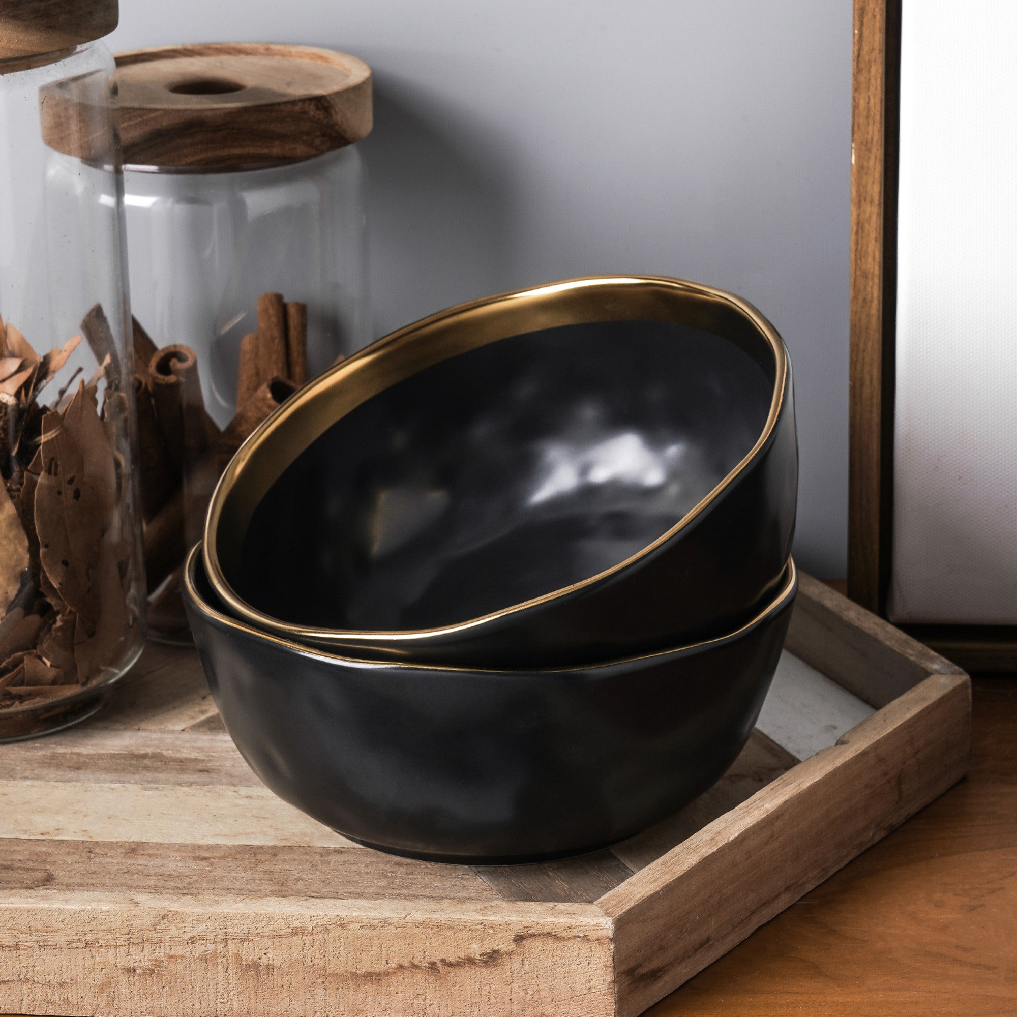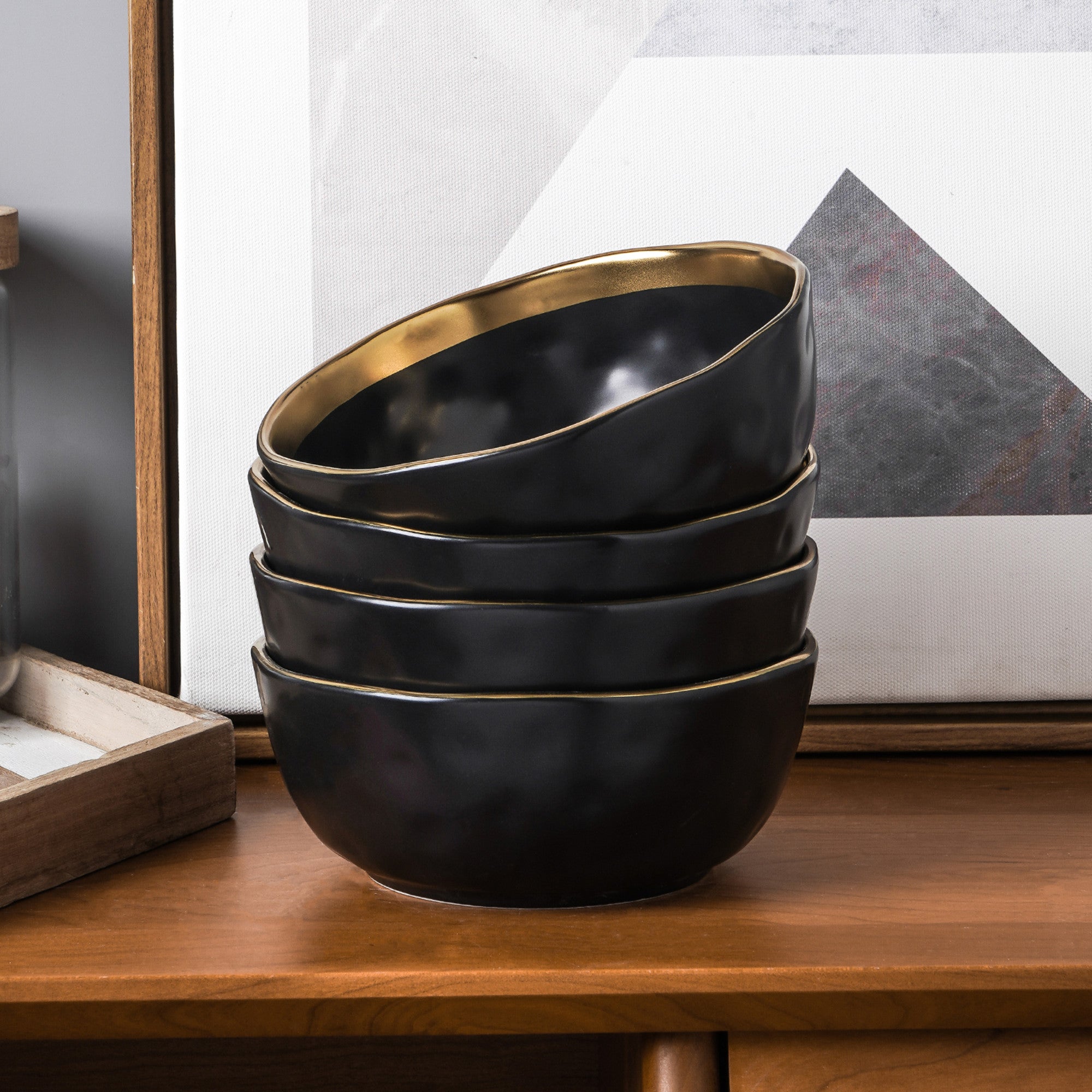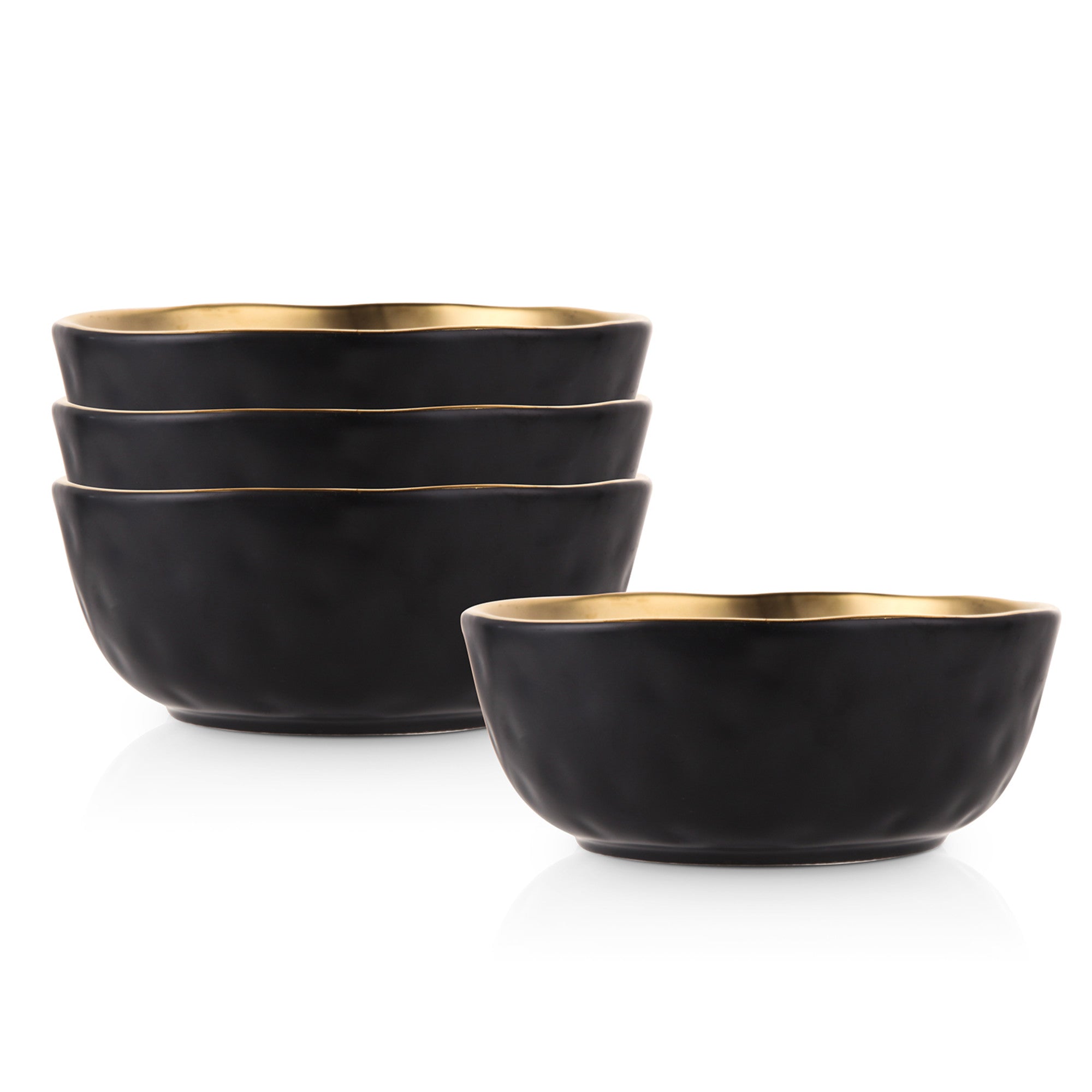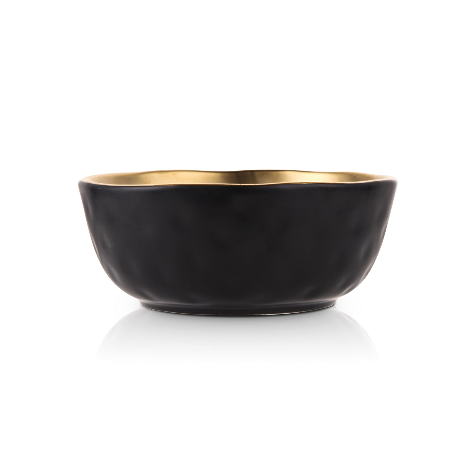 Crafted from high – quality ceramic or porcelain, these bowls feature a smooth, matte black exterior that exudes sophistication. The interior rim is adorned with a glossy, gold – toned finish, possibly gold – plated or gold – painted ceramic, creating a striking contrast that catches the eye. The wavy, irregular edge of each bowl adds a unique, artisanal touch, setting it apart from ordinary tableware.