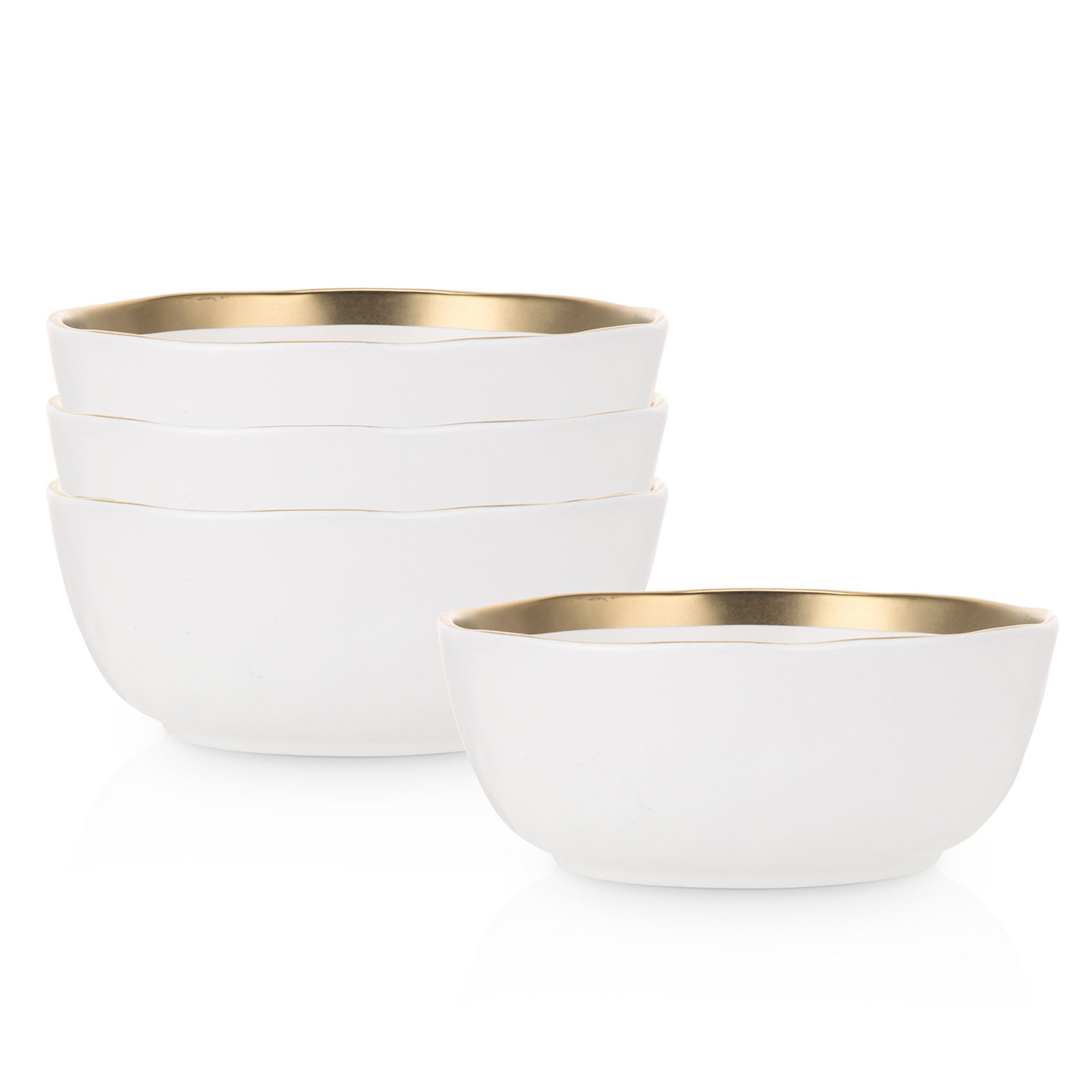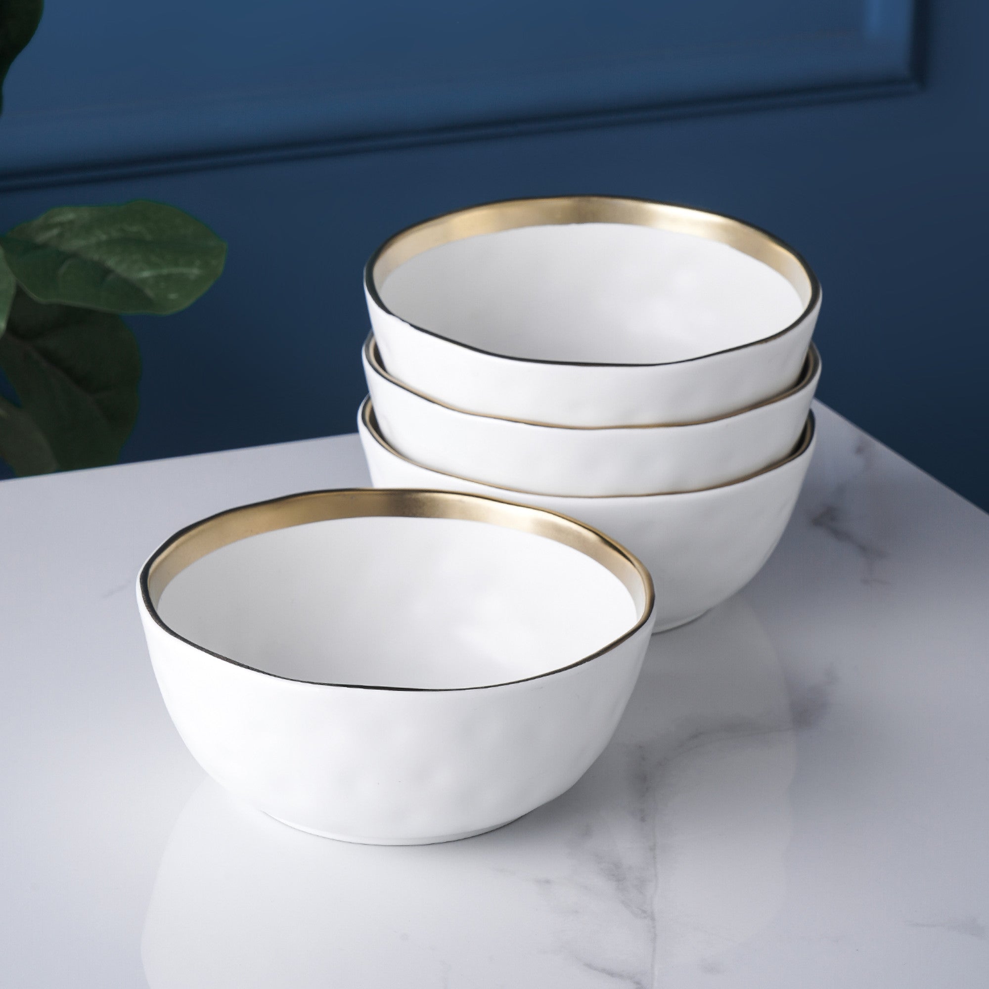 Each bowl in the set is crafted from high – quality ceramic, likely porcelain or bone china, as evident from its smooth, white, and durable appearance. The inner rim is adorned with a gold – toned metal, probably gold – plated or gold – accented, which provides a shiny, decorative finish and adds a luxurious touch to the overall design. The base color of the bowls is a pristine white with a matte or subtly textured finish on the outer surface, while the shiny gold accent runs continuously along the inner edge of the bowl opening, creating a beautiful visual contrast.