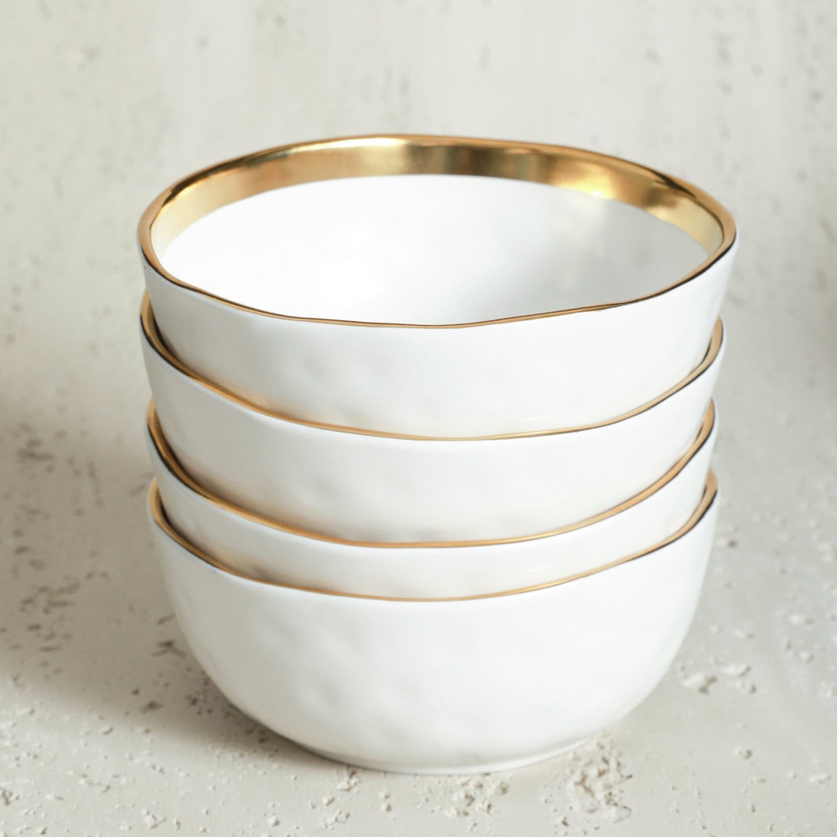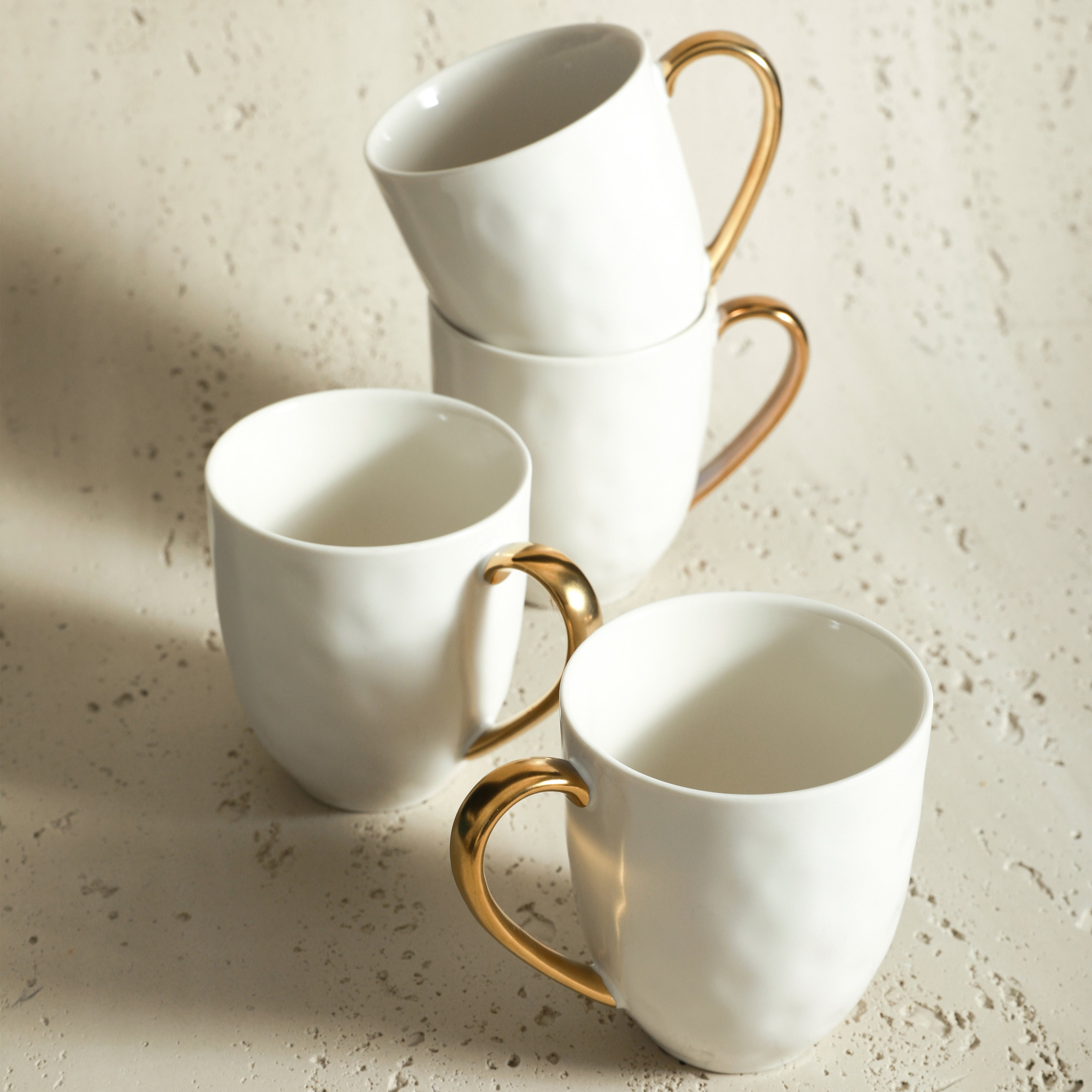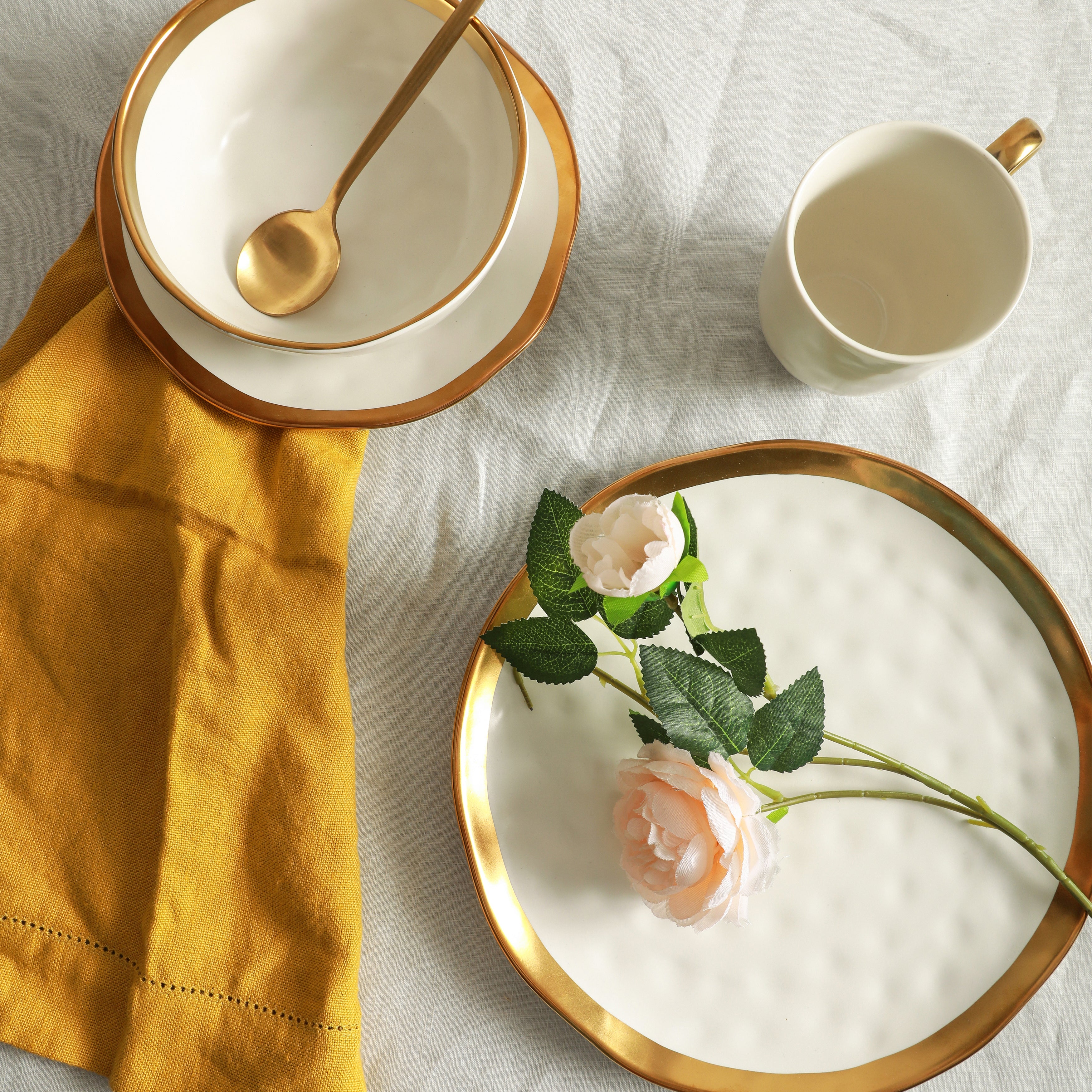 Made from high – quality white porcelain, the set features a smooth, glossy finish and a subtle hammered or dimpled texture on some pieces, adding visual interest. The gold – plated or gold – painted accents on the rims of bowls and plates and the handles of mugs bring a touch of opulence and sophistication, transforming the simple white dishware into a luxurious ensemble.