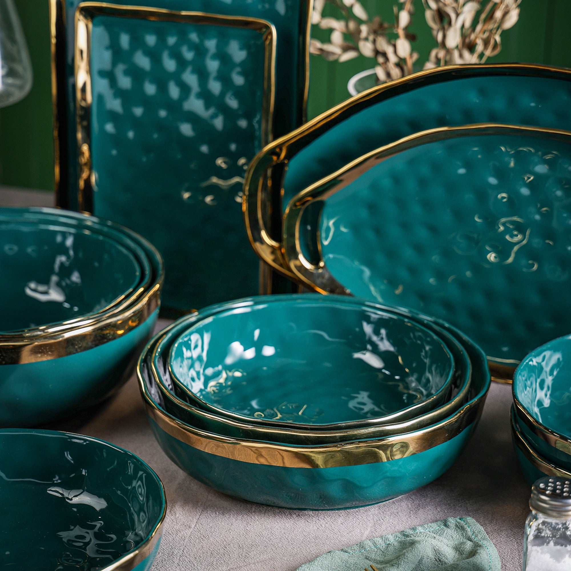 | Color & Design | Primary Color: Rich teal/emerald green; Decorative Element: Thin, shiny gold trim along the rim; Texture: Subtle, textured or marbled finish (resembling water droplets or a hammered effect) |