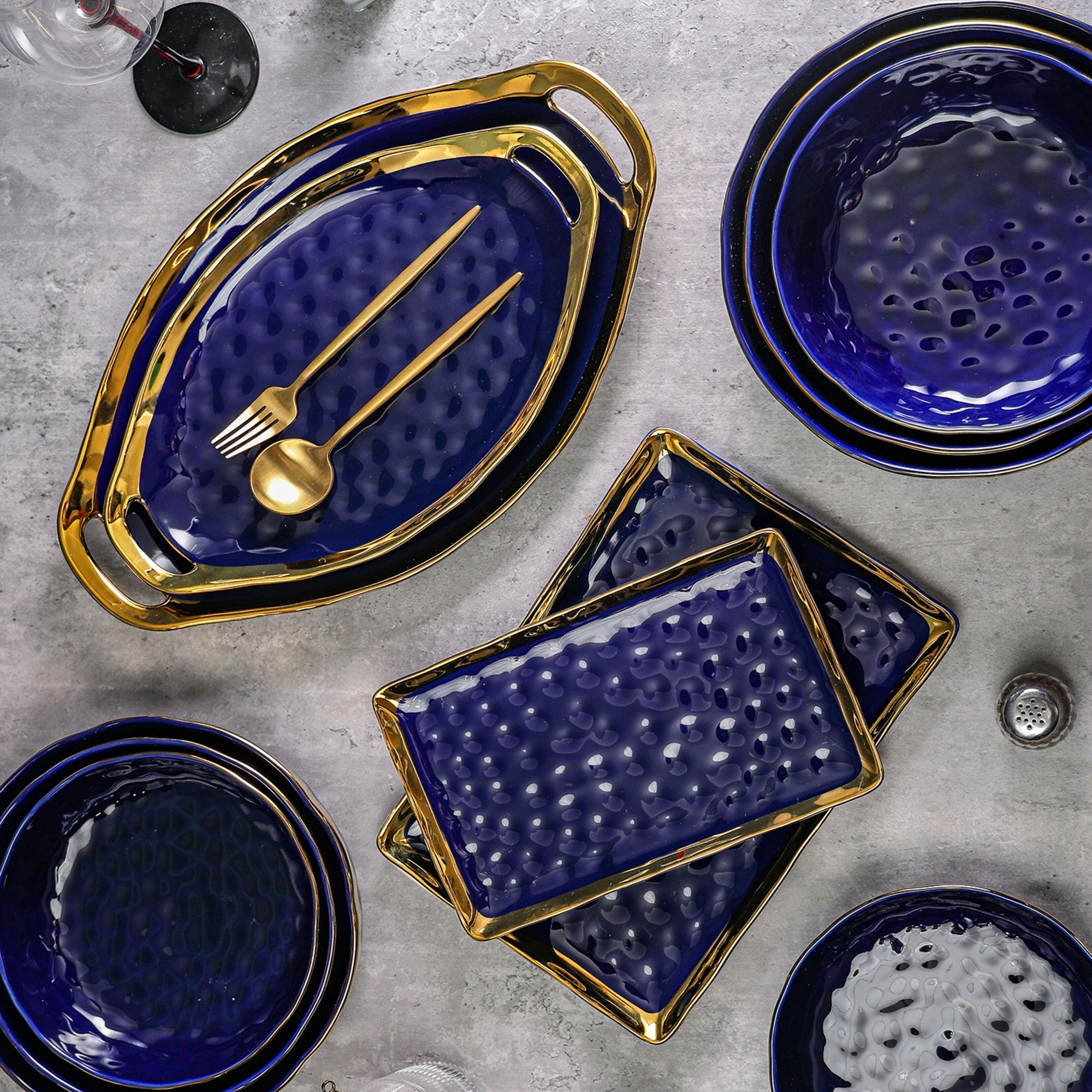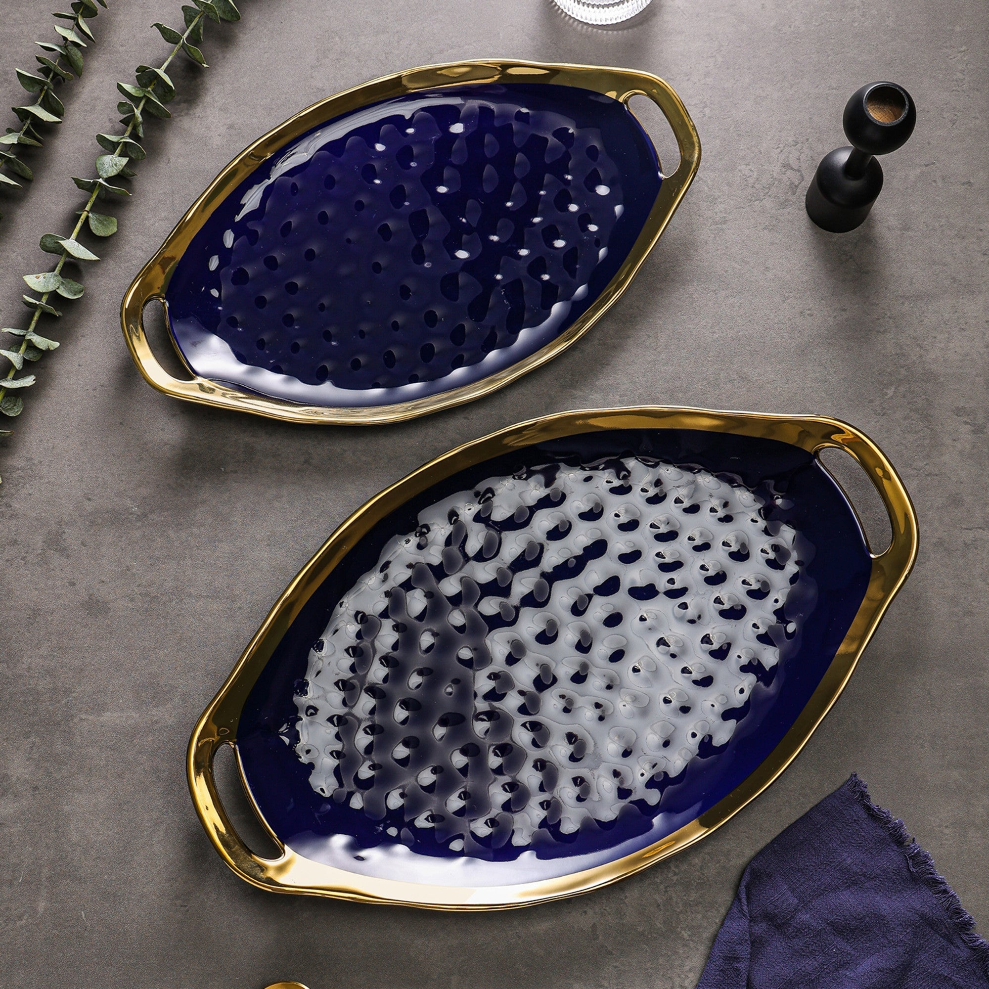 The ergonomic, curved handles are made of polished gold – plated metal (likely brass or stainless steel with a gold coating), which not only makes it easy to carry the platters without burning your hands when serving hot food but also adds a high – end, metallic finish that contrasts sharply with the blue, enhancing the opulent aesthetic. The gold plating has a shiny, scratch – resistant finish, and the ceramic resists chipping, ensuring durability with proper care.