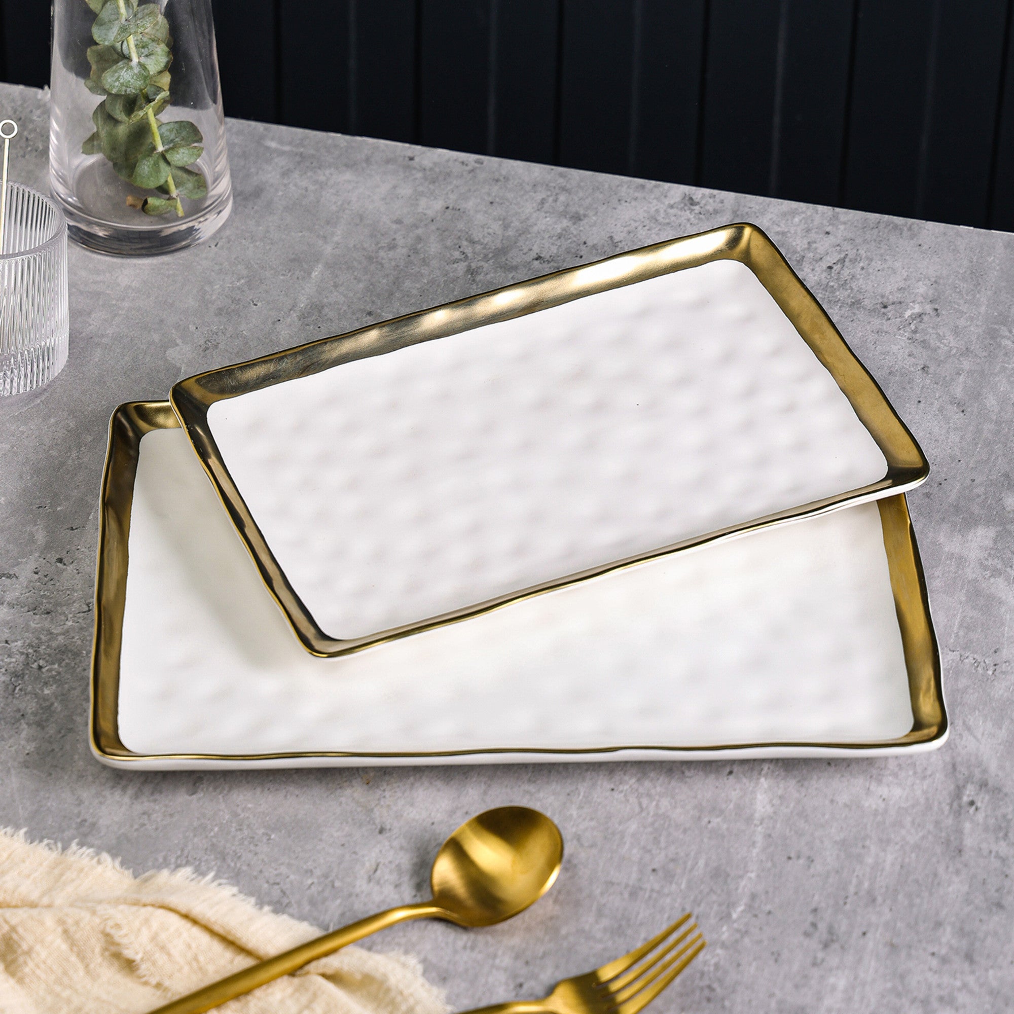 The set consists of two rectangular ceramic serving trays/plates, each crafted from high – quality porcelain with a smooth, glossy finish. The dominant white base is adorned with a shiny gold – plated metal trim around the edges, giving it a luxurious and reflective look. The white surface features a subtle, embossed pattern of small dots or bubbles, adding both visual interest and a tactile appeal. The rectangular shape has slightly rounded corners, creating a clean and modern aesthetic.