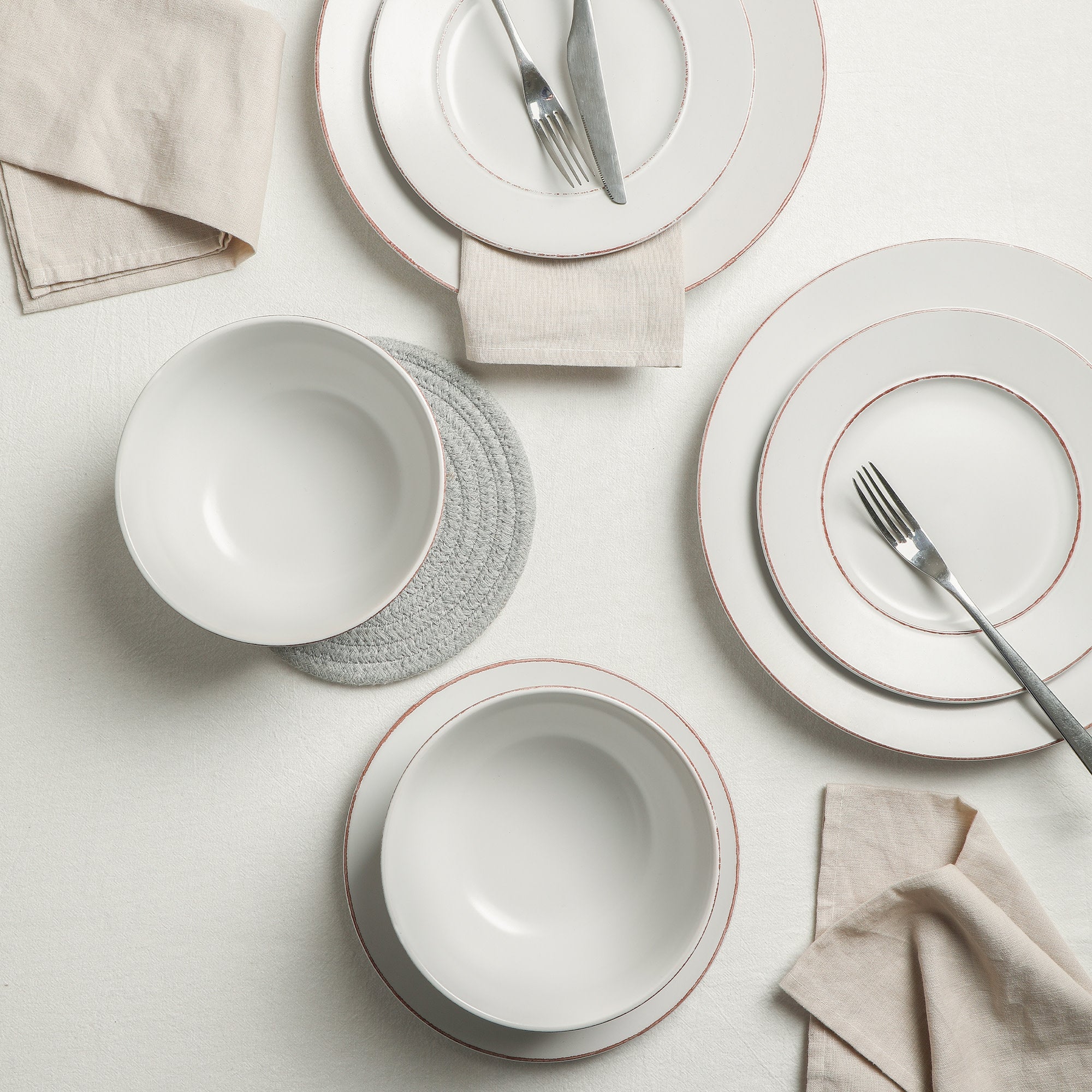 The set features accents of uniquely colored, hand – painted rims and an earthy, semi – matte finish that draws out the natural texture of each dish. The minimalist yet elegant design combines clean lines with subtle detailing, offering a timeless look for your table.