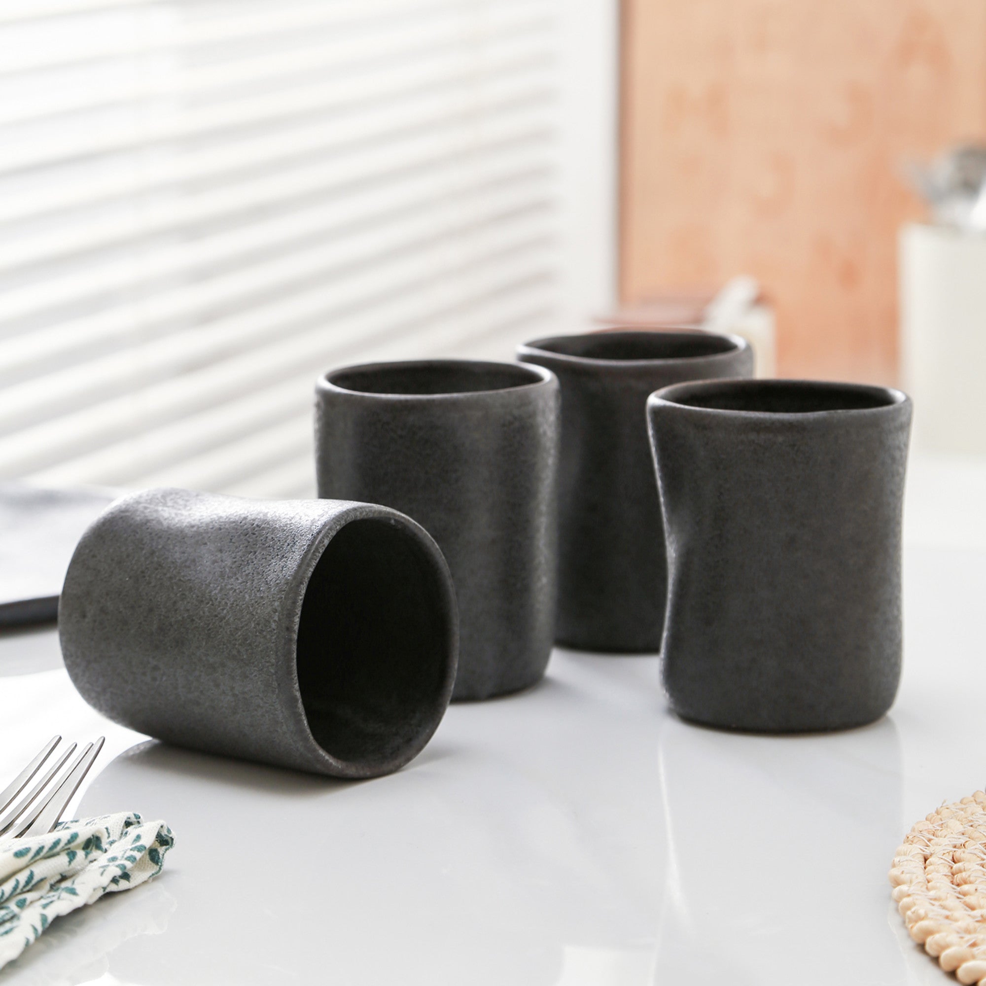 In terms of color and design, the primary color is a sophisticated dark gray to charcoal black with a uniform matte tone. The minimalist and modern shape features clean lines, while the slightly irregular, organic edges of the plates and bowls enhance the rustic, handmade aesthetic. The cups have unique, twisted or curved profiles, adding an extra touch of individuality. There’s also a decorative stamp or engraving on the bottom of the cups, such as “NEVER FIND LESS THAN ALL”, which gives a personalized and branded feel.