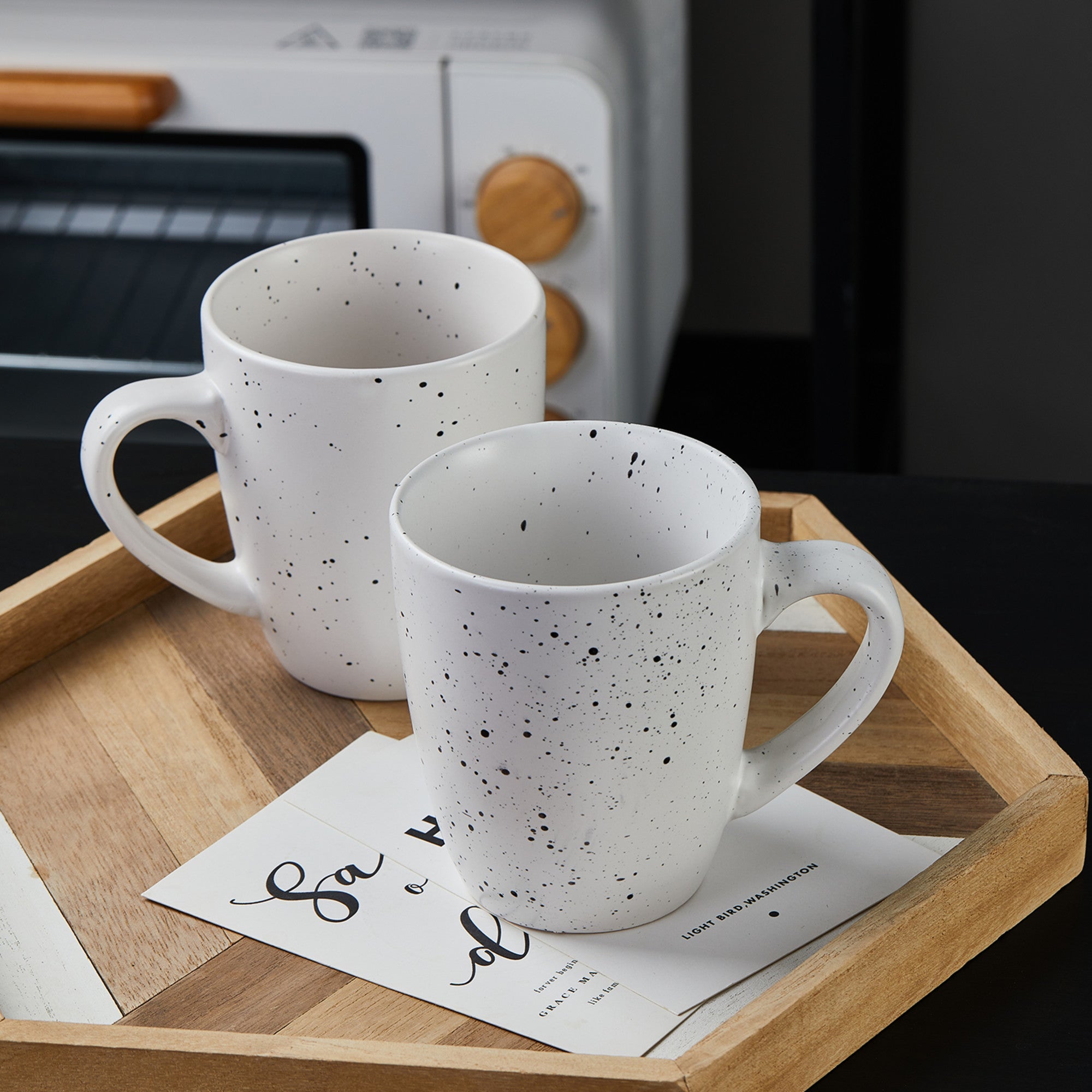 The white base color of the dishware, combined with the black speckles, creates a minimalist, modern, and slightly rustic aesthetic. The set comes in various standard sizes: the bowls are about 6 – 8 inches in diameter and 2 – 3 inches in height, the dinner plates are around 10 – 12 inches in diameter, the salad/side plates are 8 – 9 inches in diameter, and the mugs are approximately 4 – 5 inches in height and 3 inches in diameter.