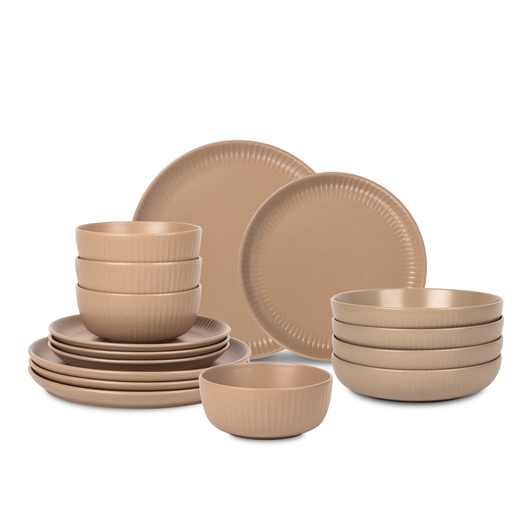 Featuring minimalist and modern design elements, the set includes plates and bowls with vertical ribbing. The plates have a ribbed outer rim, which not only adds a decorative touch but also provides a bit of grip. The bowls have vertical ribbing along their outer surface, creating both a textured grip and visual interest. This uniform, cohesive design across all pieces allows for versatile mixing and matching for different meals.