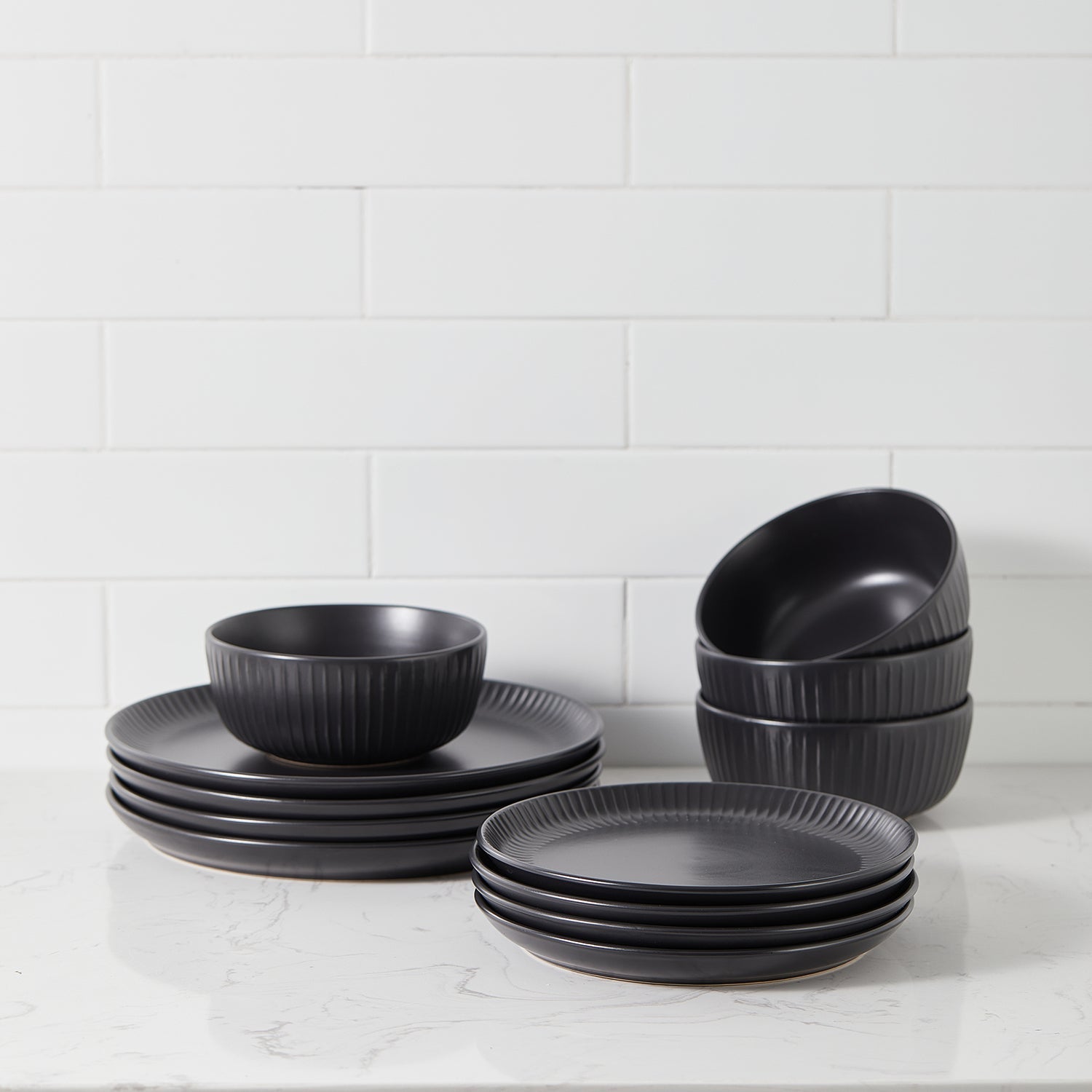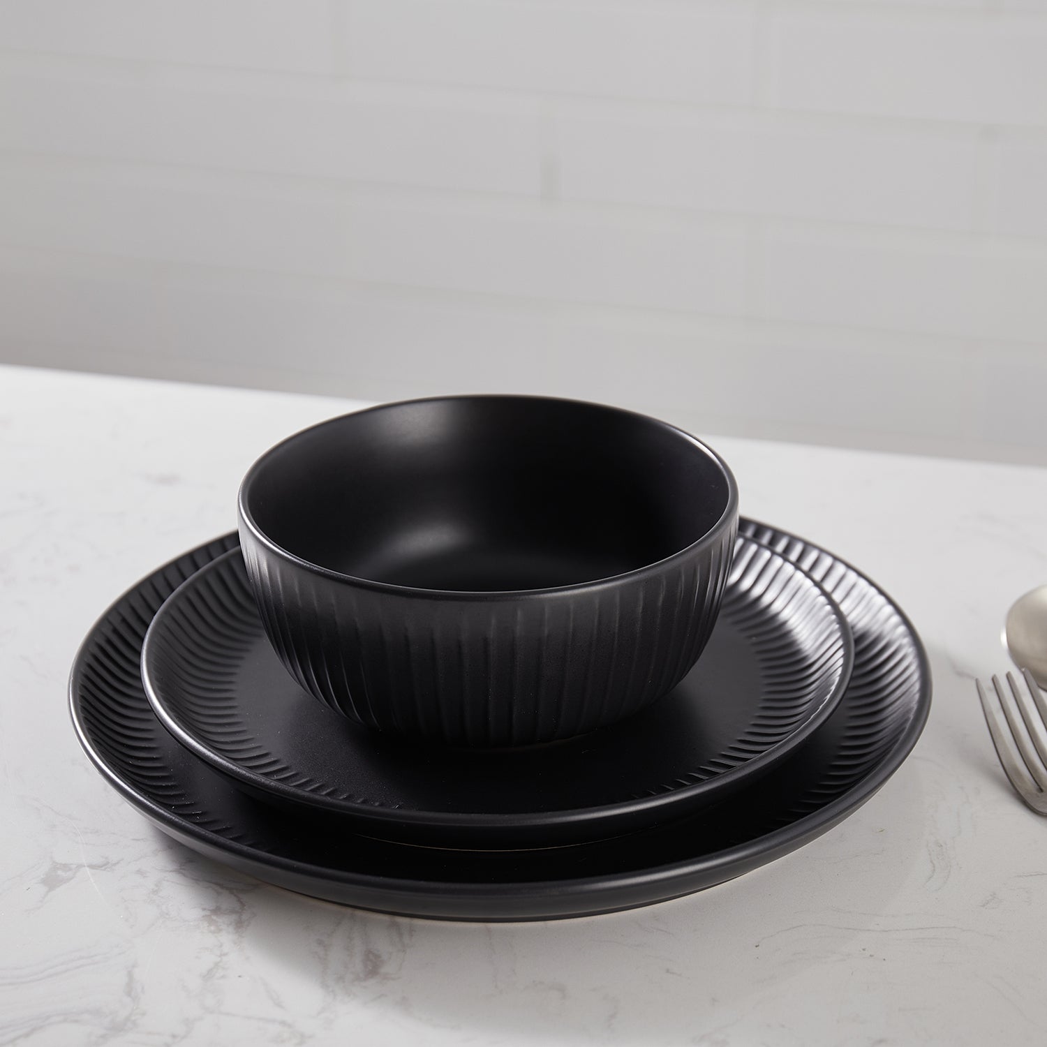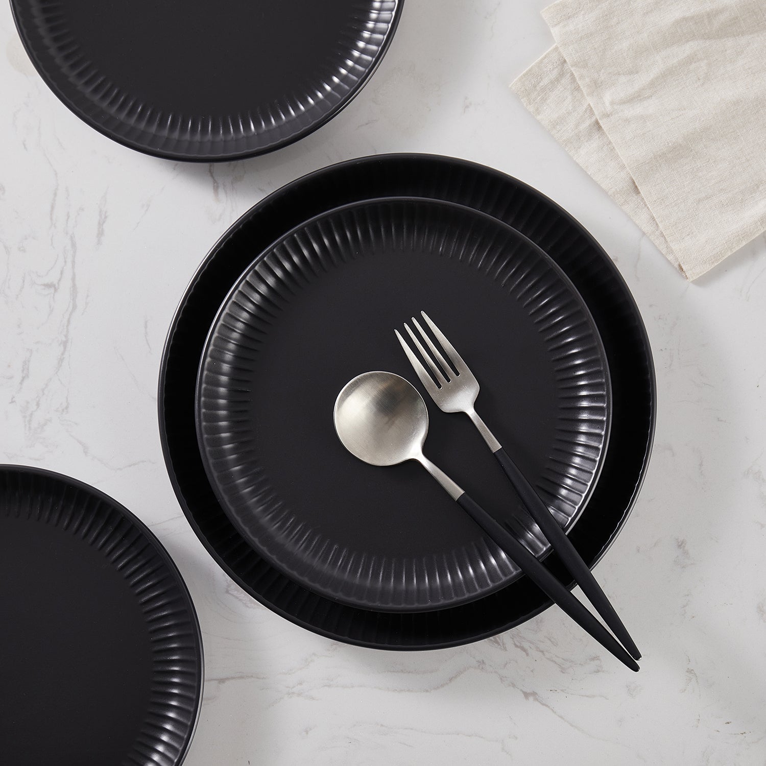 Elevate your dining experience with the mercvo mercvoware Dinnerware mercvo – Black #2. This high – quality set is crafted from ceramic or stoneware, offering a smooth, matte finish and a sturdy, solid appearance perfect for daily use. The primary color of the set is a sleek matte black, free of patterns or secondary colors, and it features a ribbed pattern on the outer edges of plates and outer sides of bowls. This textured detail not only adds a modern, contemporary aesthetic but also provides a subtle grip and visual interest.
