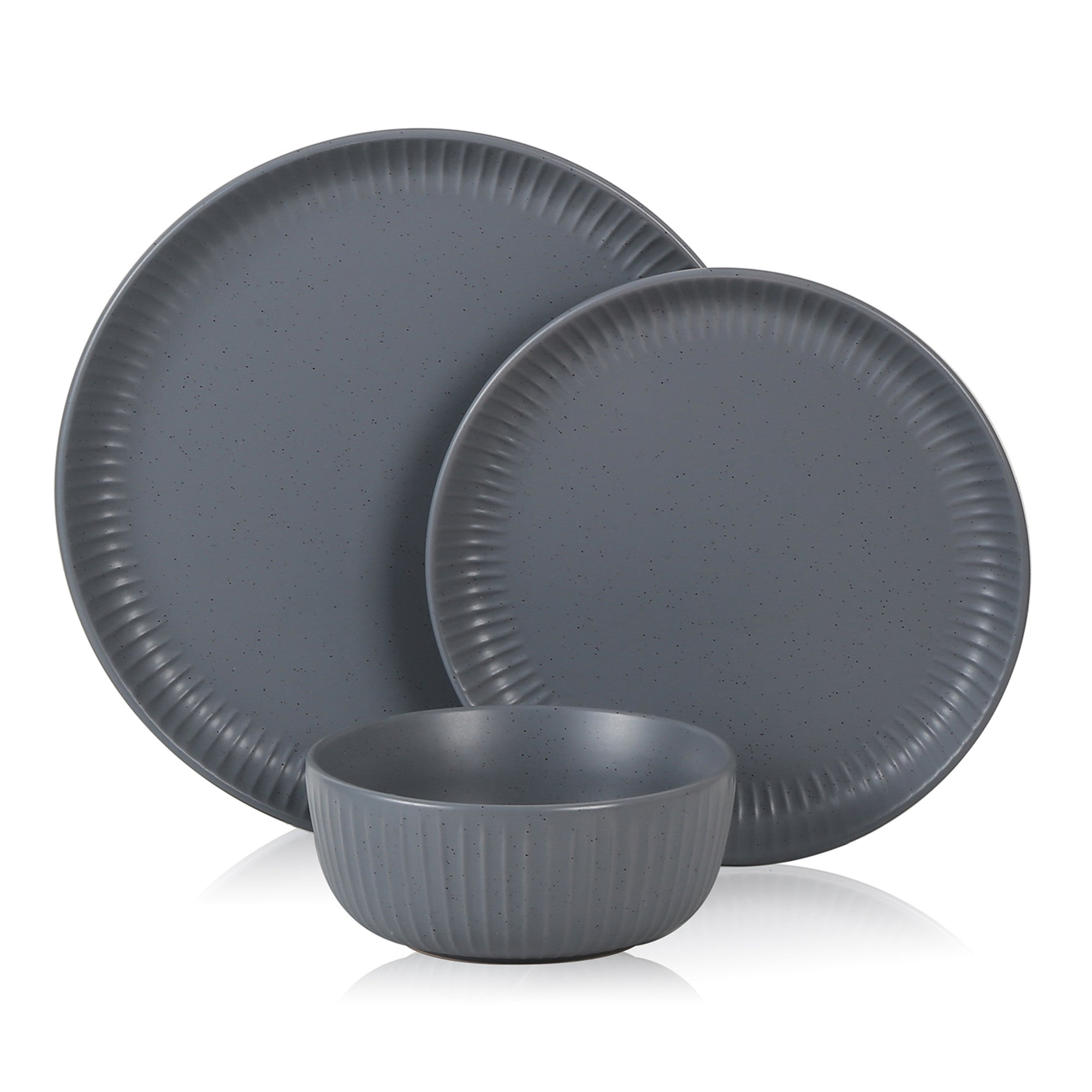 The set comes in a beautiful muted, cool gray color with subtle speckling, adding a touch of texture. The plates and bowls feature vertical ribbed/textured detailing along their edges, which not only adds visual interest but also provides a better grip, reducing slipping when handling. The matte finish is not only stylish but also low – maintenance, hiding minor scratches and fingerprints.