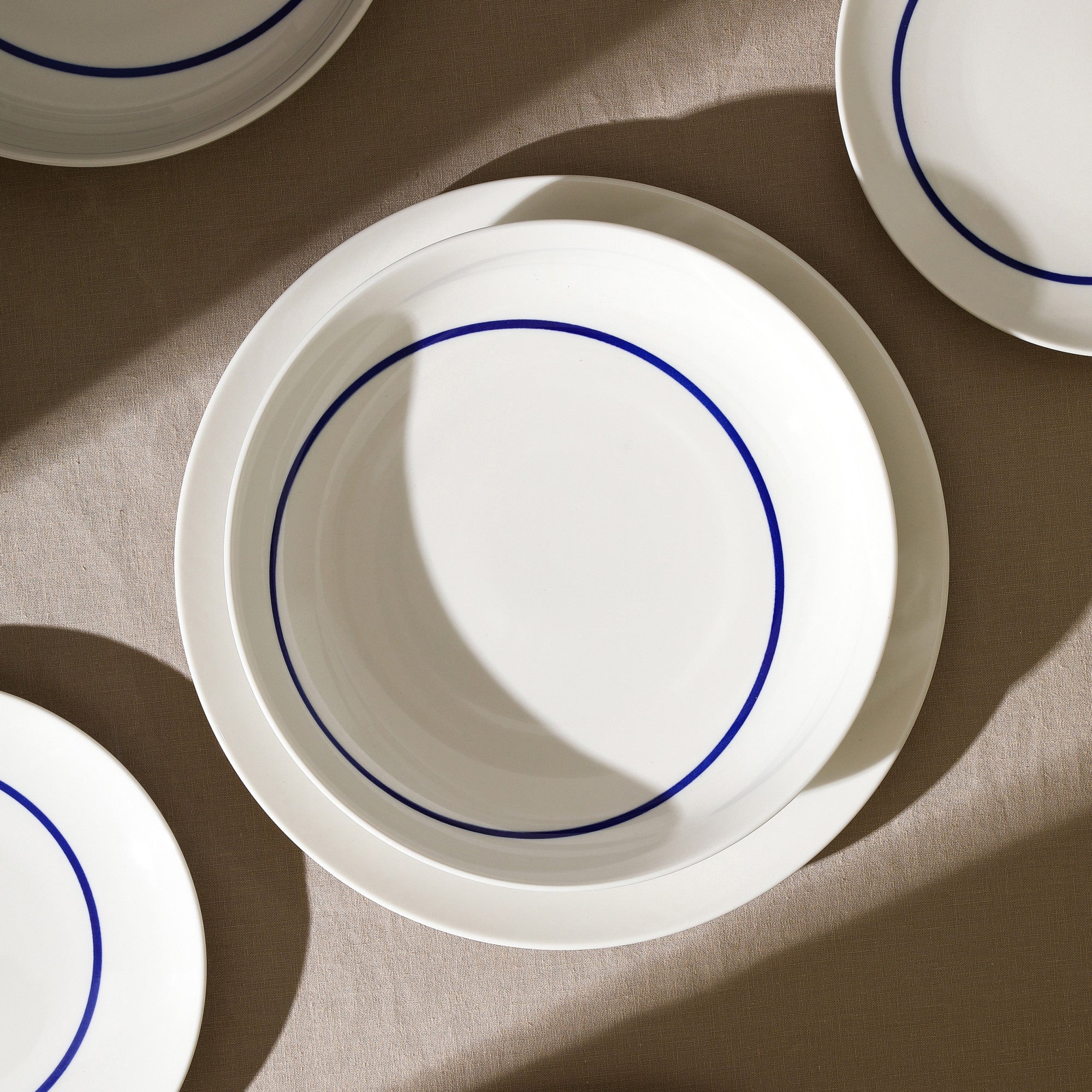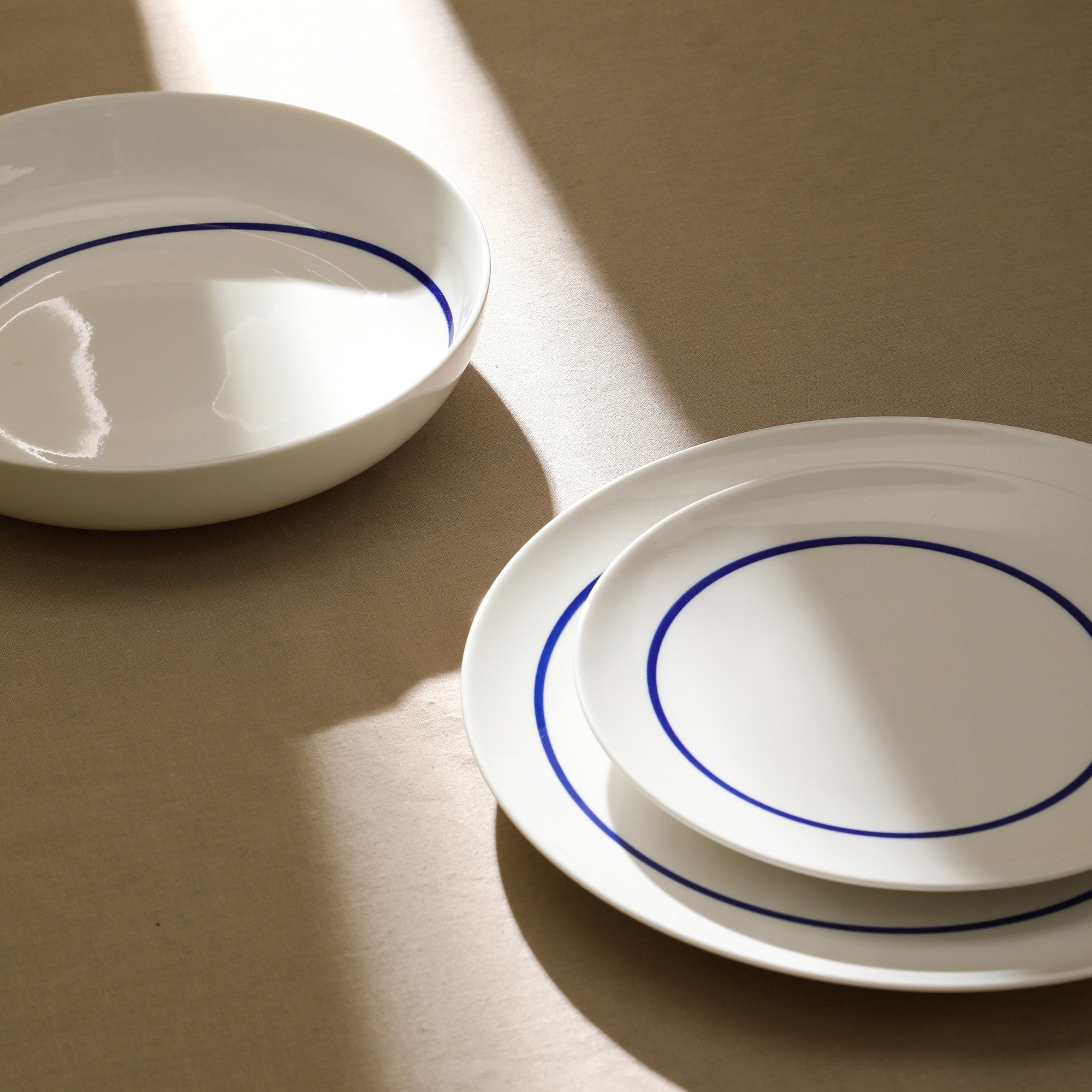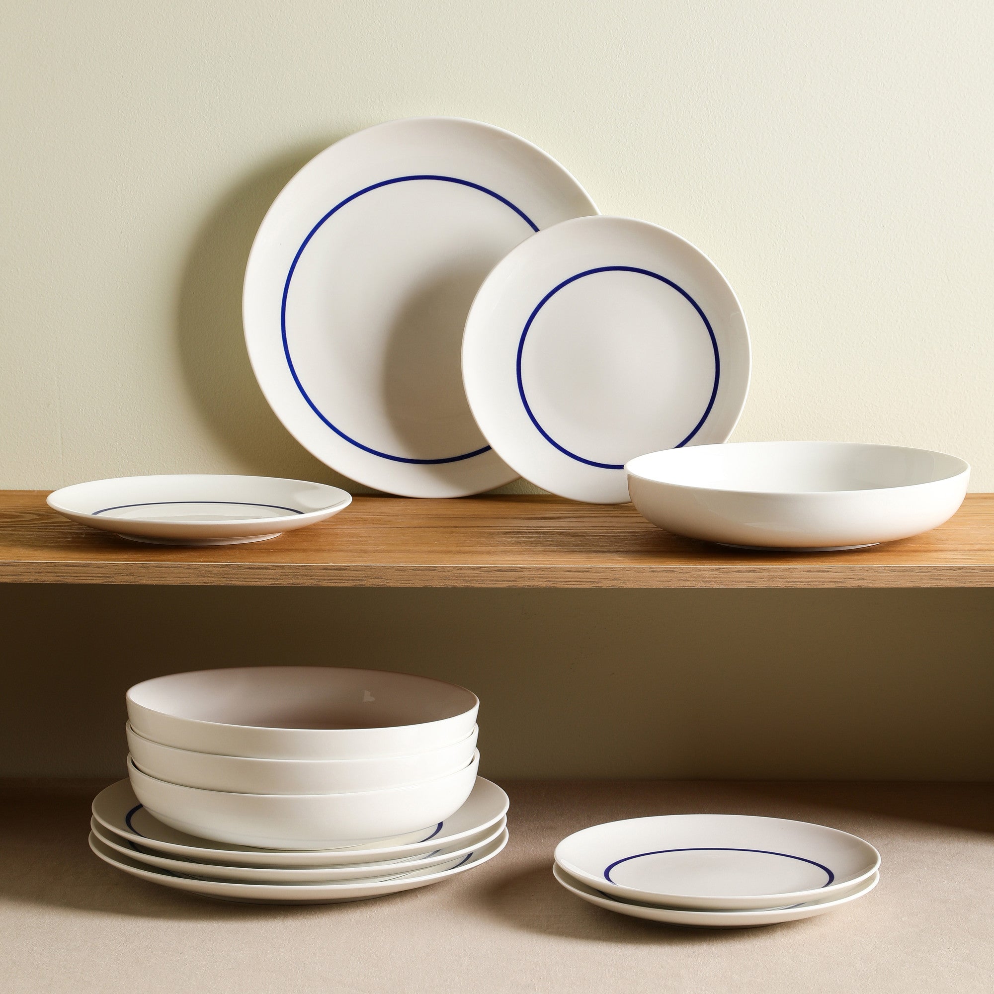 The minimalist and modern design features a solid white base, accented by a vibrant blue circular line or two concentric blue lines on some plates, creating a clean and classic aesthetic. The blue trim is evenly applied, adding an elegant contrast to the white background and giving the set a cohesive look. Whether you’re hosting a formal dinner party or enjoying a casual family meal, this set’s versatility allows it to complement any table setting.