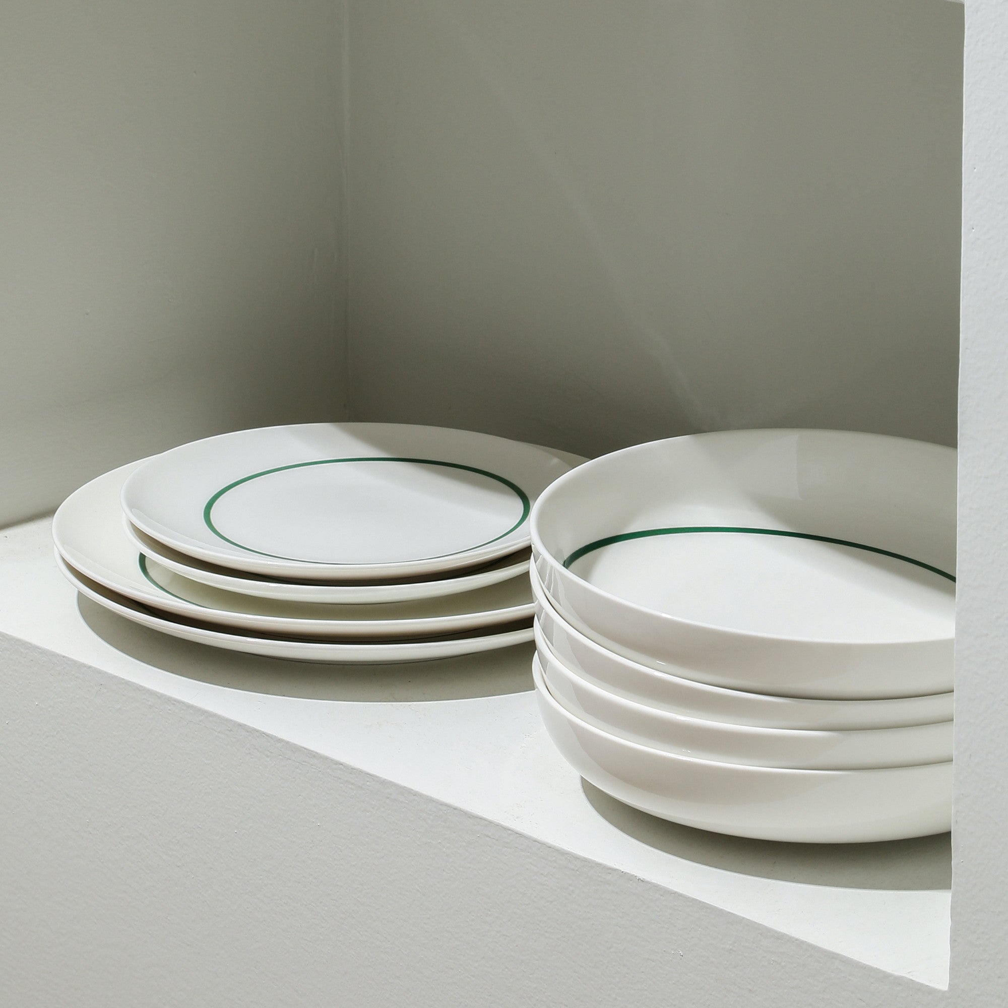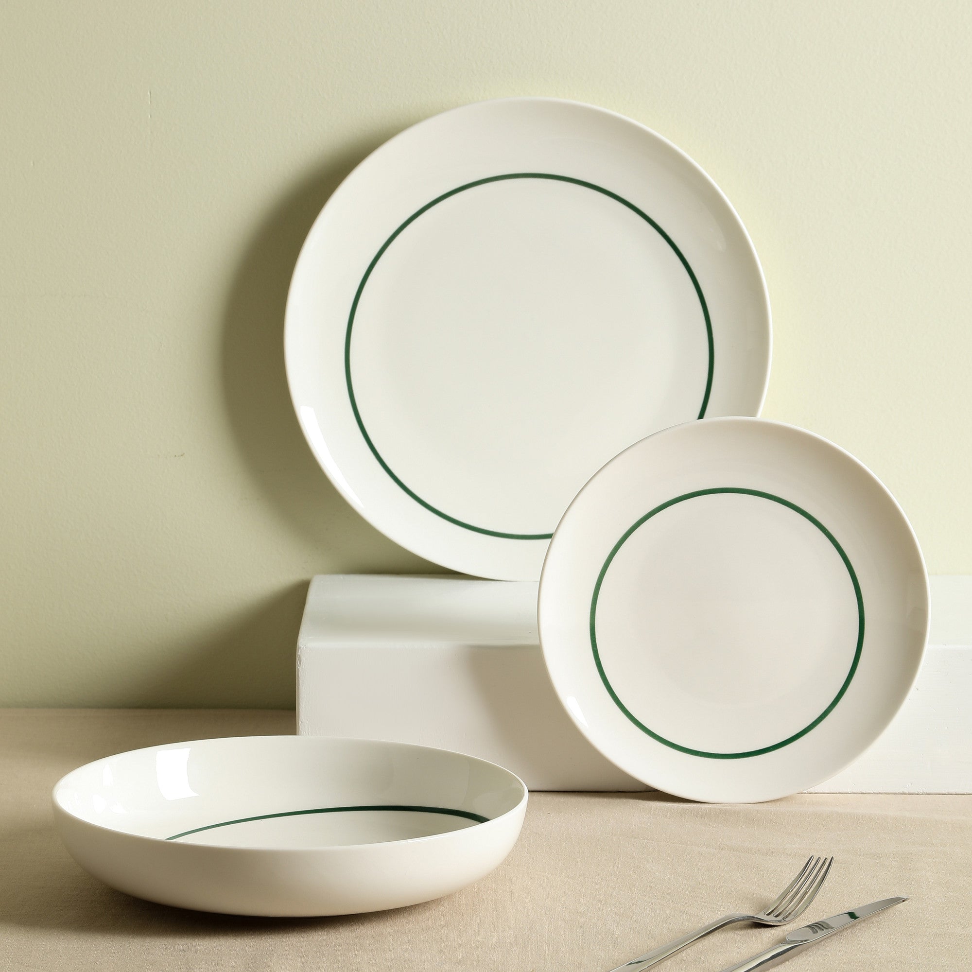 The set features a minimalist and modern design aesthetic, with a classic white base color on all pieces. A single, thin green circular line adorns the interior or rim of each item, adding a subtle retro touch while maintaining a clean and uniform look. The cohesive design with the uniform green circular line across all pieces ensures a coordinated appearance on your dining table.