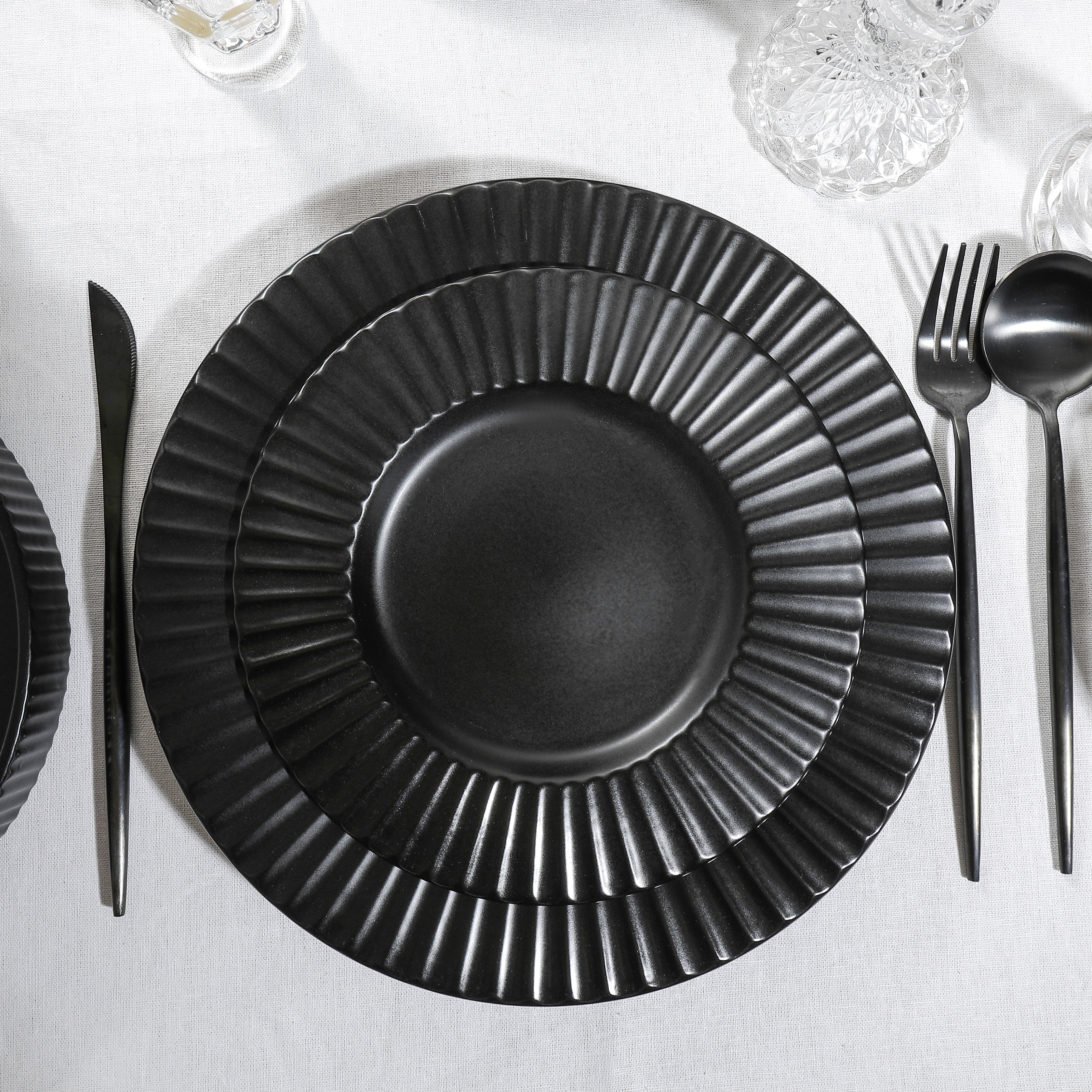 Featuring vertical ribbed patterns on the outer edges of bowls and plates, along with fluted/pleated outer rims on the plates, this dinnerware set adds a decorative texture and tactile interest. The minimalist, monochromatic design with clean lines is both modern and versatile, ensuring it complements any table setting.