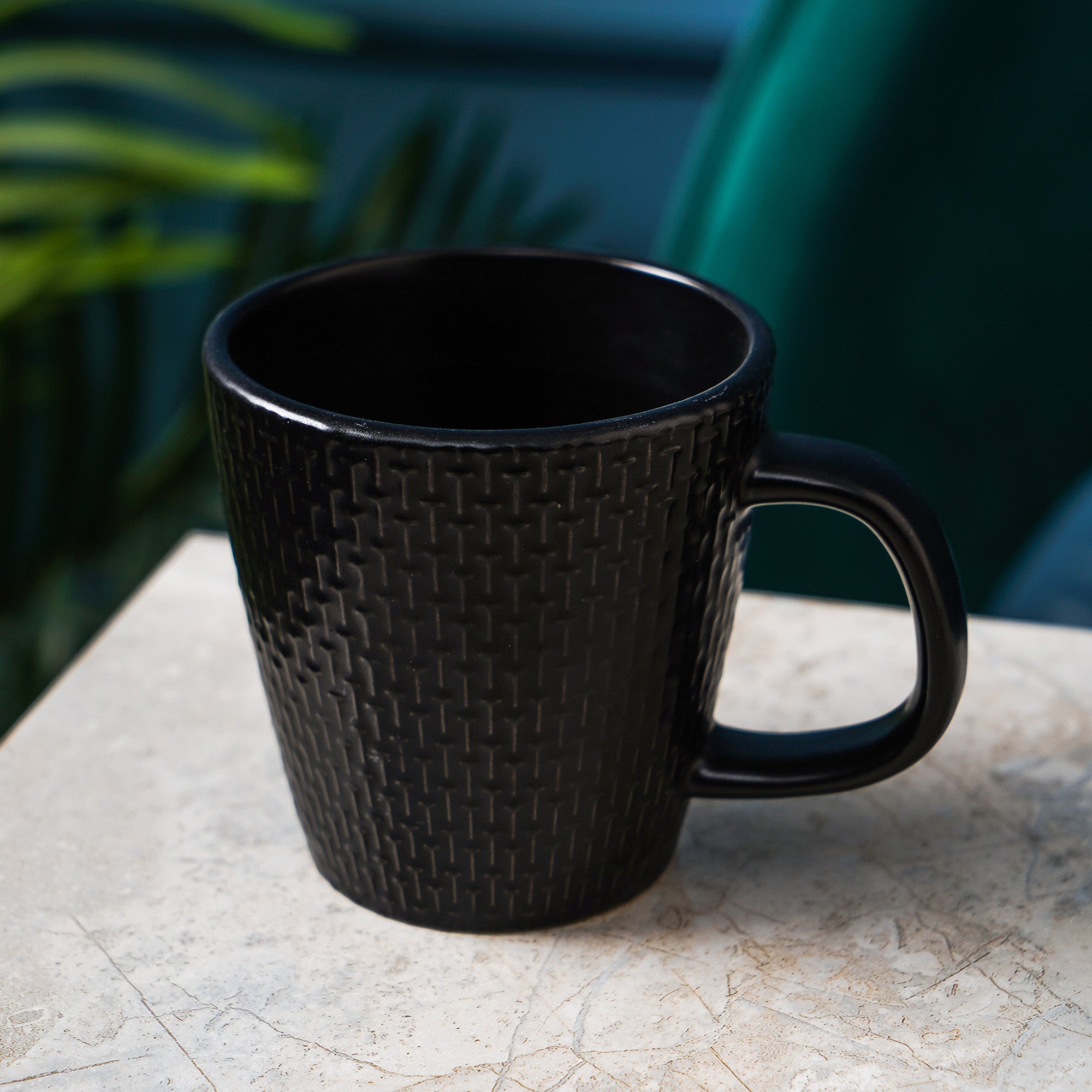 The mugs feature a solid, uniform black color both on the interior and exterior. The exterior showcases an embossed geometric/woven pattern, resembling a basketweave or brickwork. This pattern not only adds visual interest but also provides a subtle anti – slip effect for a better grip. The interior is smooth, making it easy to clean and preventing residue buildup.
