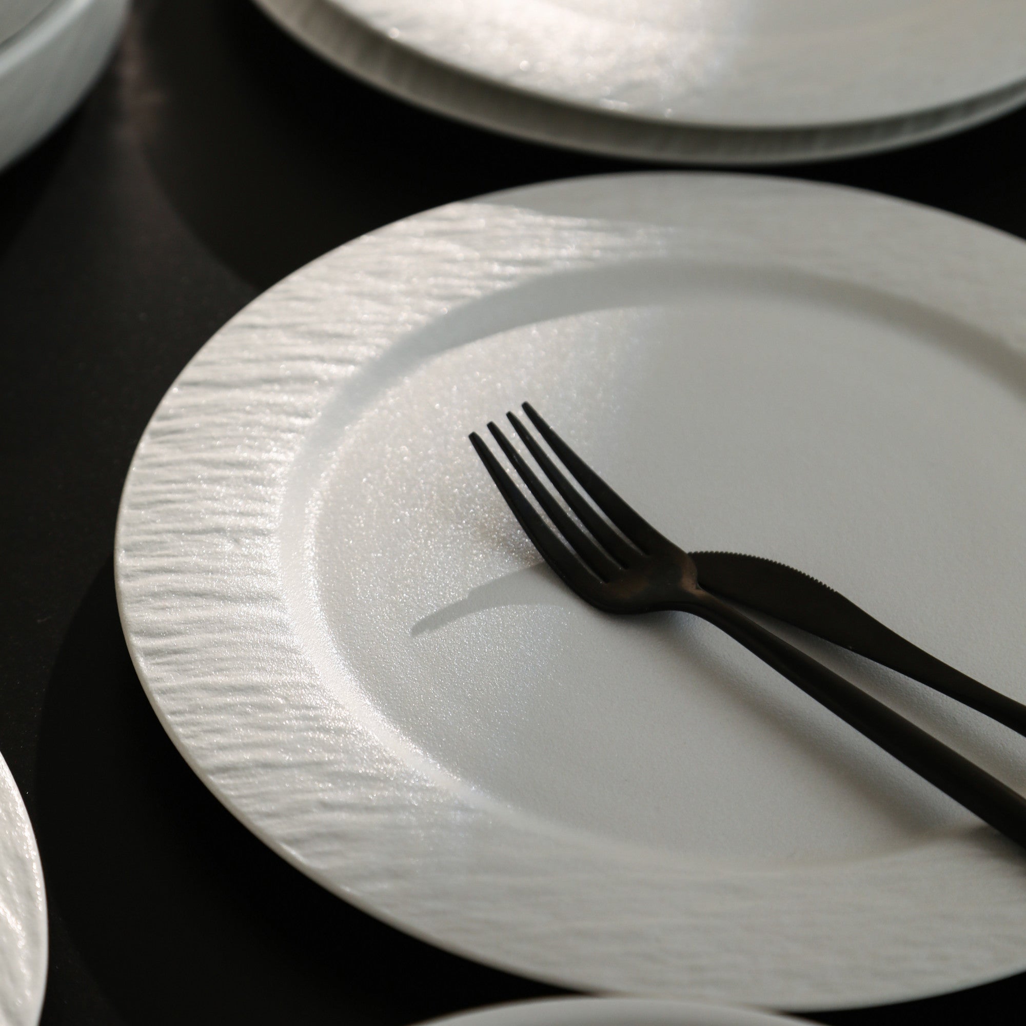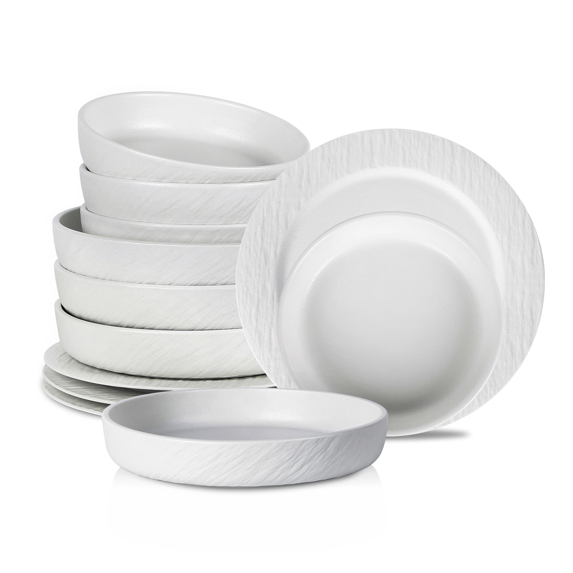The dinnerware set consists of white, textured bowls and plates, ideal for tabletop use such as dining and serving. The dishes are made of ceramic or porcelain, evident from their smooth, glossy interior, matte finish, and sturdy stacking behavior. The subtle linear texture on the exterior, resembling fine ribbing or hand – pressed lines, adds a touch of visual interest without being overly ornate.