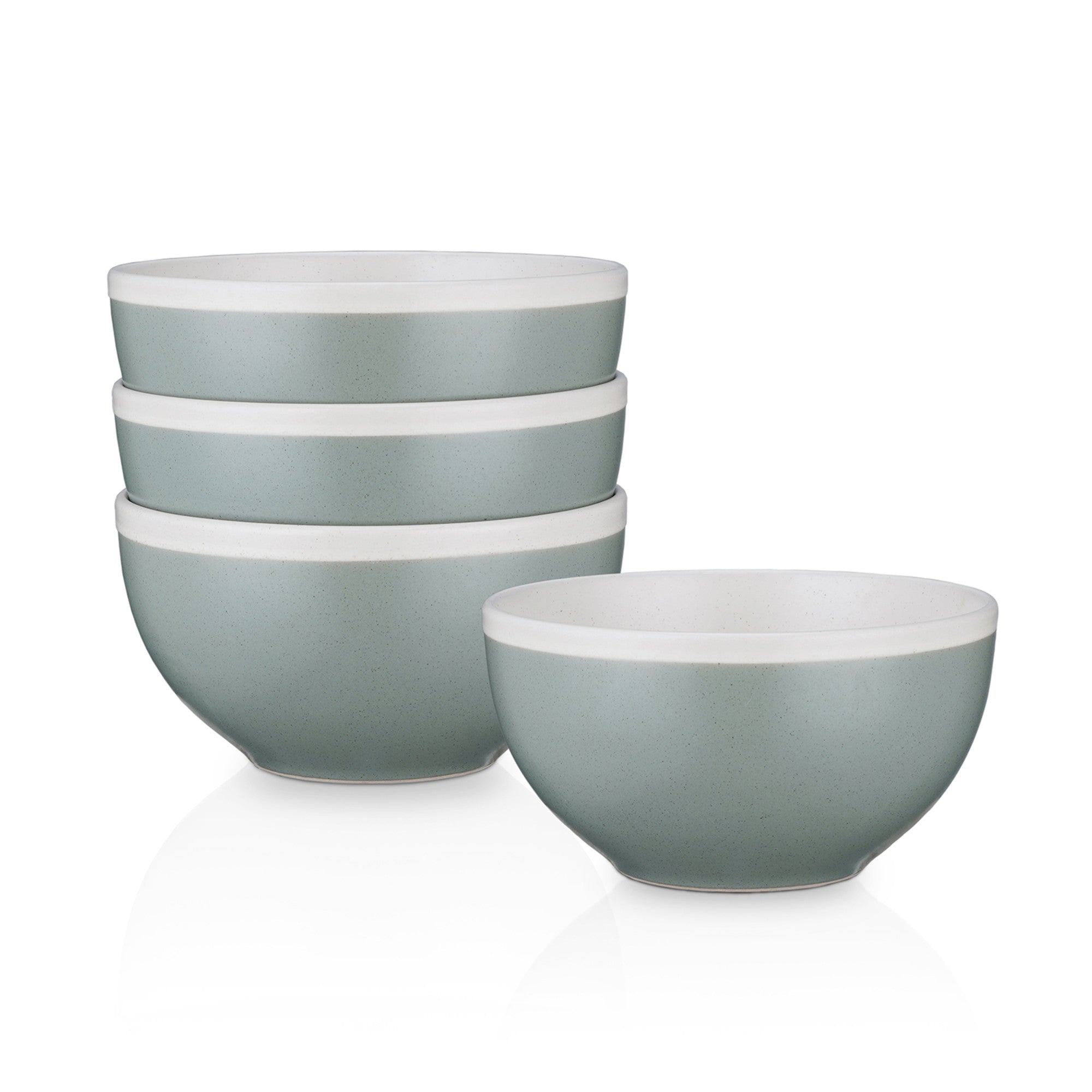 The set includes 4 ceramic bowls expertly crafted and artfully designed, reminiscent of afternoon tea parties. The exterior of the bowls features a muted sage green color with a smooth, slightly matte finish and a speckled texture, suggesting a natural clay or stoneware finish. The interior is a solid white with subtle speckles, adding an artisanal, textured look. A thick white band around the top edge contrasts with the green exterior and white interior, creating a clean and stylish aesthetic.