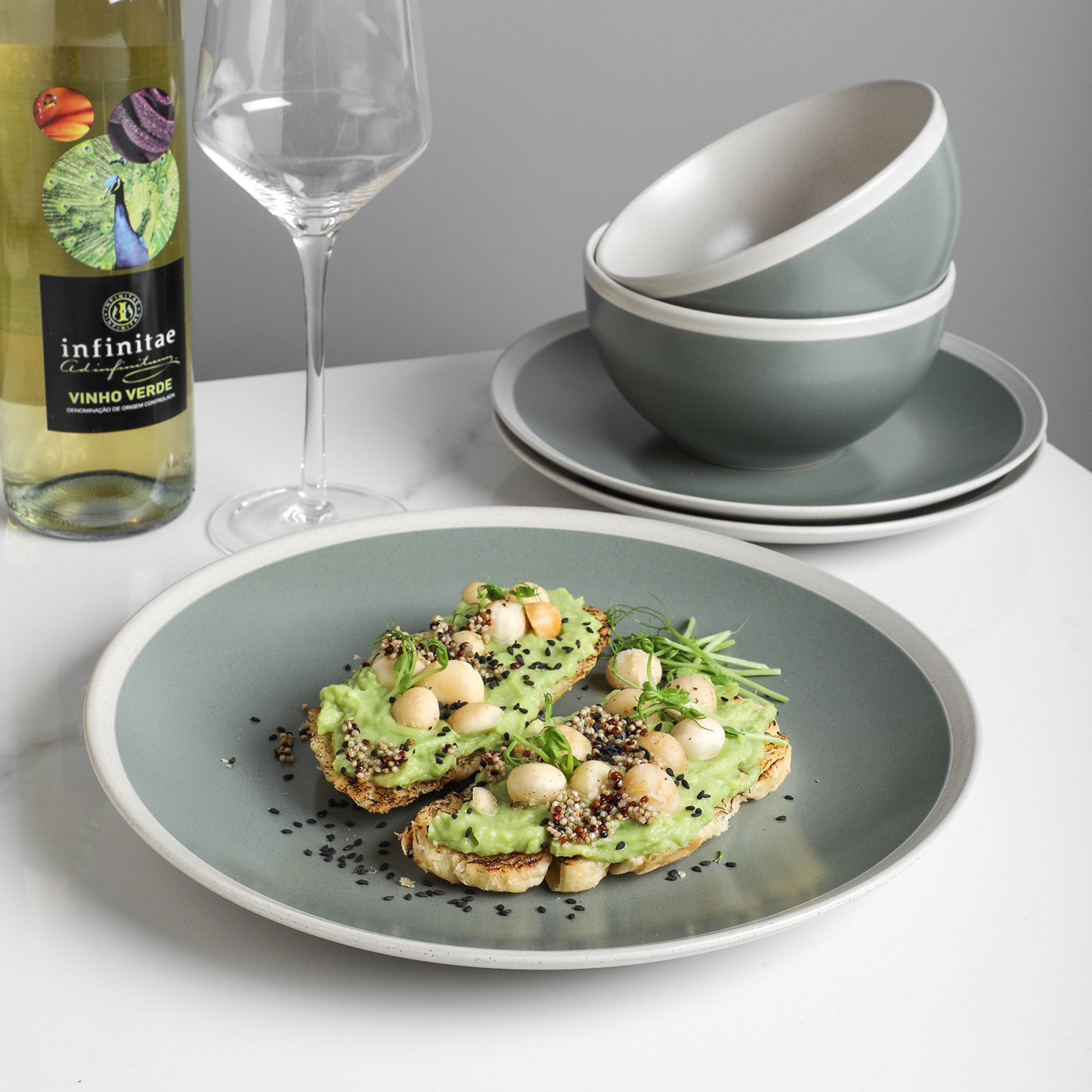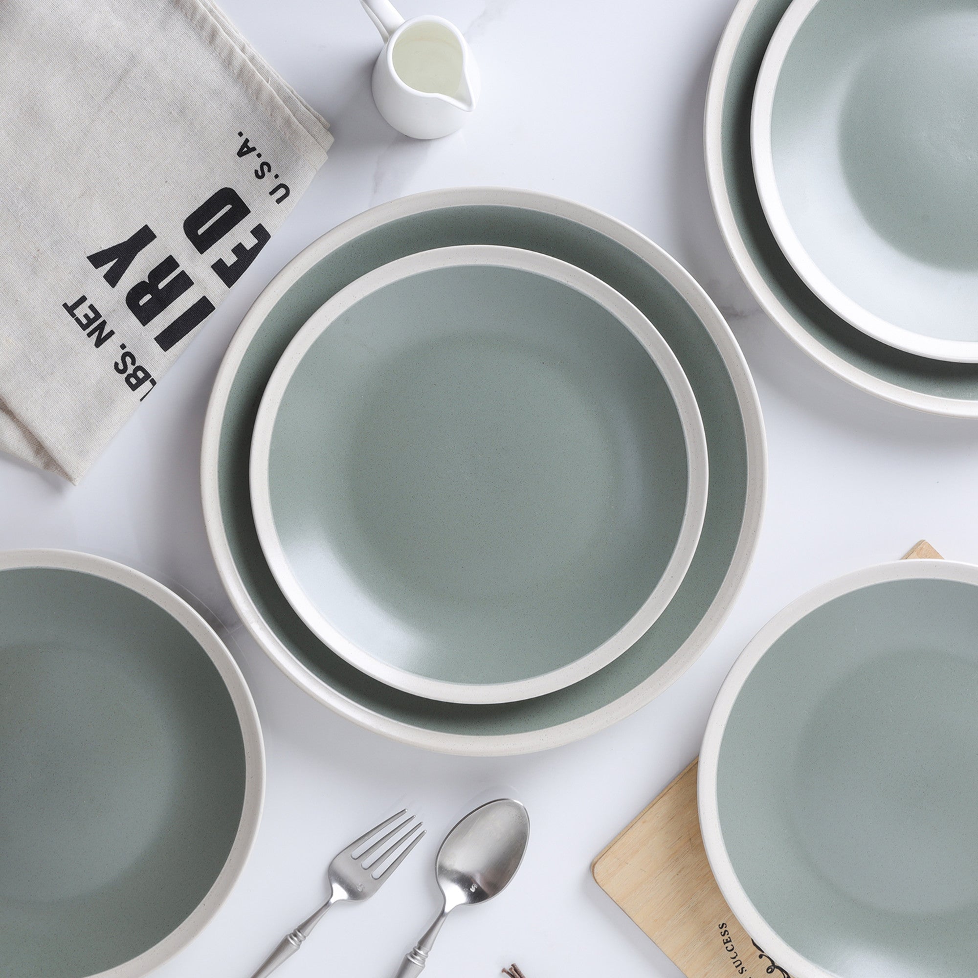 The plates are made from high – quality ceramic (stoneware), evident from their smooth, even surface with a subtle textured finish and a consistent color application. The primary color of the plate interior is a muted sage green, offering a calming and modern aesthetic, while the clean white (or off – white) rim provides a striking visual contrast, inspired by Scandinavian minimalism. With no additional patterns, the focus is on the smooth, solid – color surfaces with a subtle speckled glaze, emphasizing simplicity and versatility.