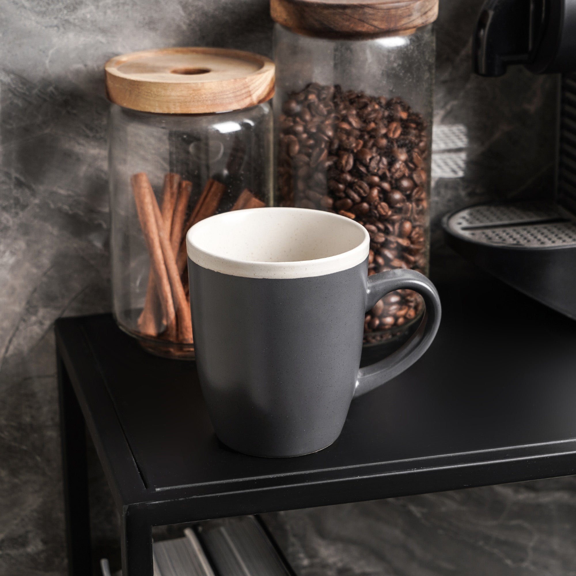 Each mug in this set features a dark gray (charcoal/steel gray) exterior, while the interior and rim are white with subtle speckling, adding a touch of natural texture. The minimalist design with clean lines and a sharp contrast between the white rim and gray body creates a visually striking look. The white interior not only provides a polished appearance but also makes it easy to spot any residue, simplifying the cleaning process.