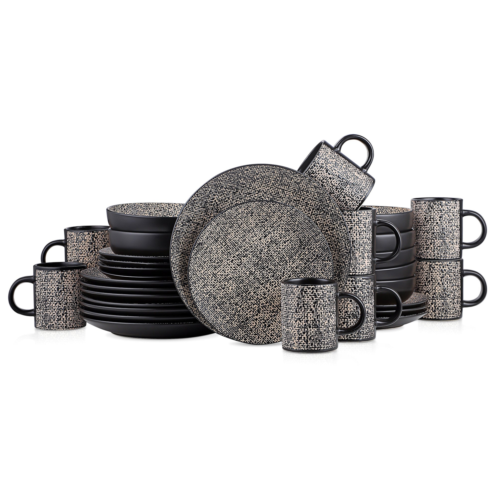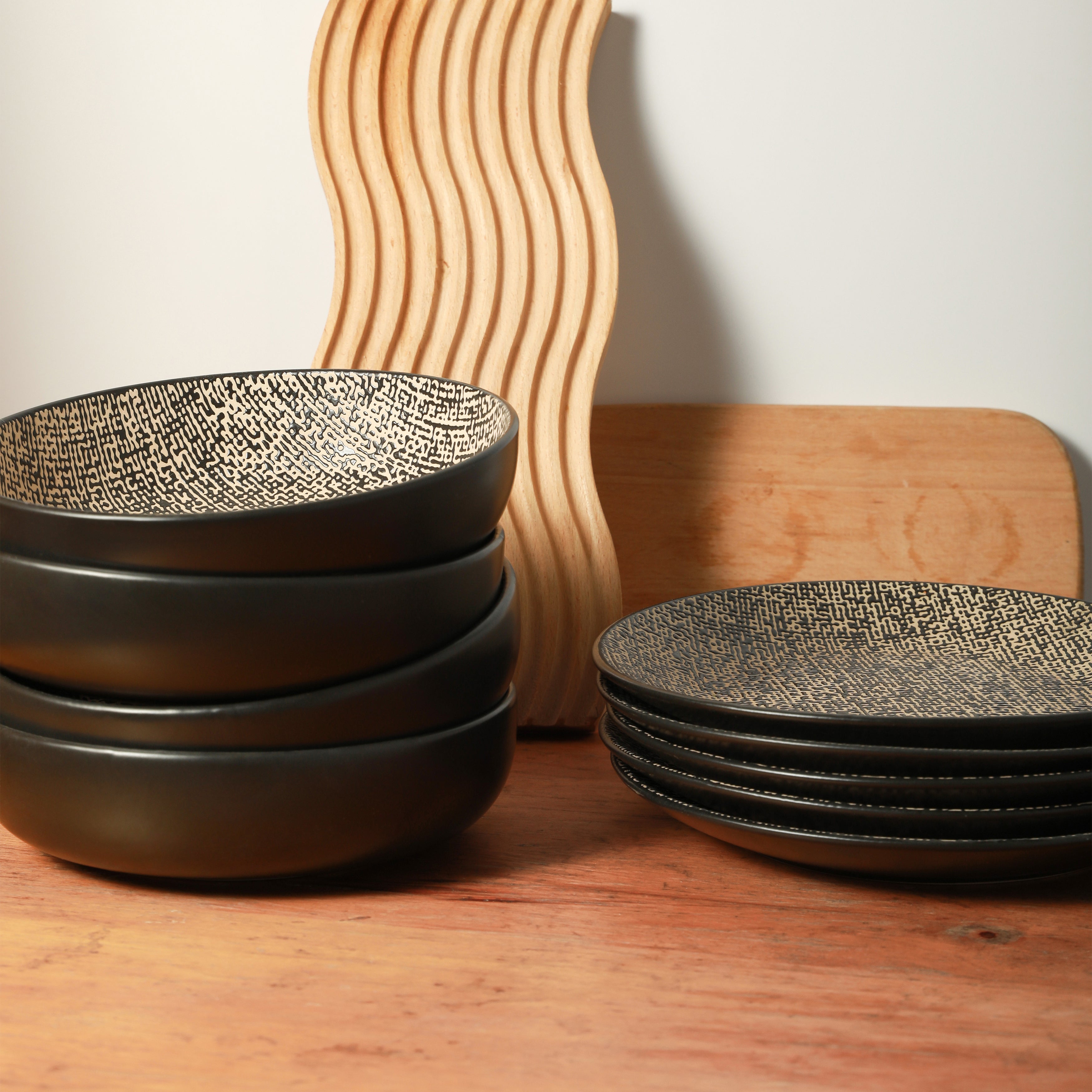 The coordinated abstract pattern, resembling dense, irregular lines or dots in black and off – white, covers the interior of all pieces. This high – contrast design between the matte black exterior and the patterned interior creates a minimalist yet artistic look with visual depth. All pieces share the same pattern, ensuring a cohesive table setting.
