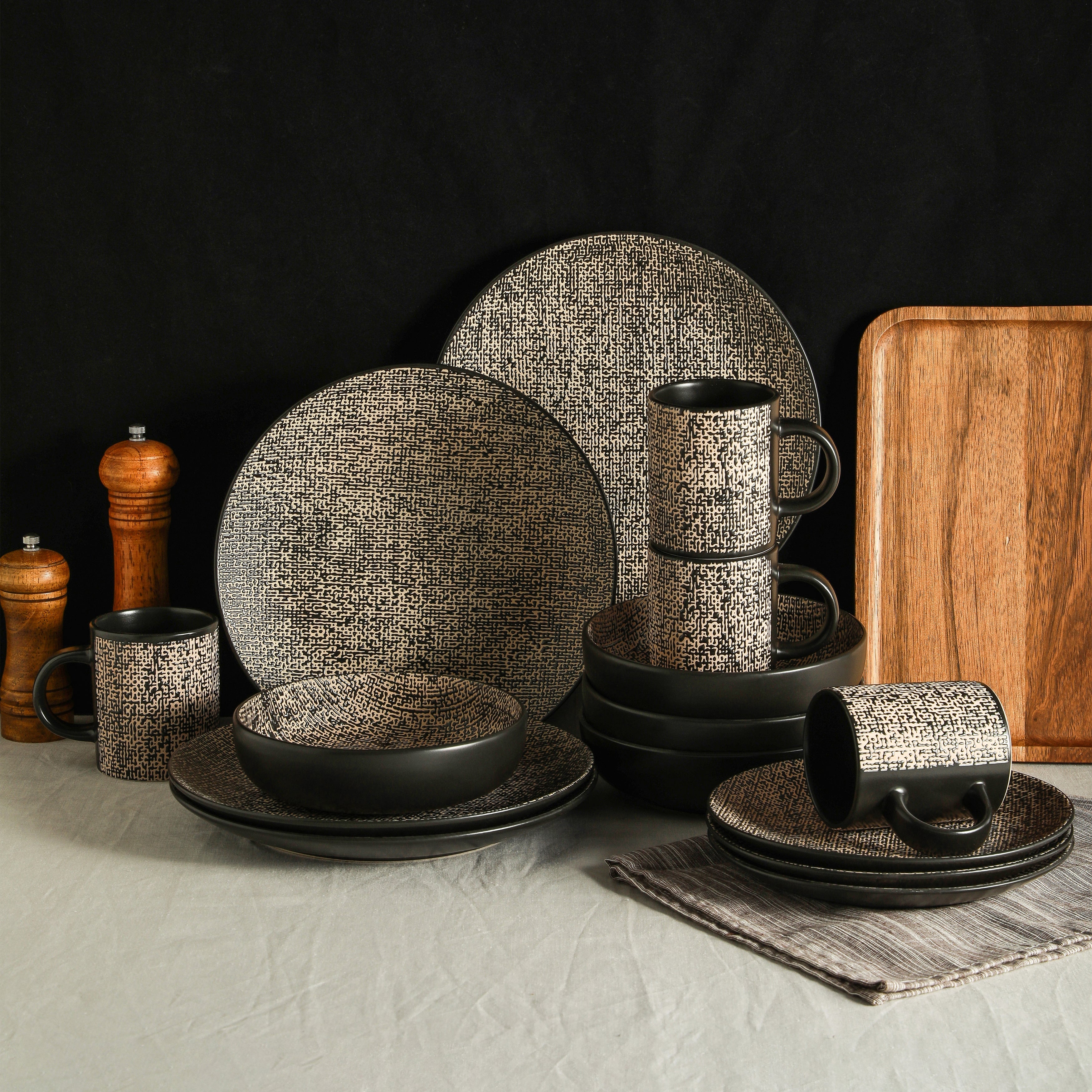 Indulge in a delightful dining experience with the mercvo mercvoware Dinnerware mercvo in Brown and Black. This set is a harmonious blend of rustic charm and modern aesthetics, making it a perfect addition to any home. The interior of each piece features a fun textured design, while a thick black rim adds an artsy and unique touch.