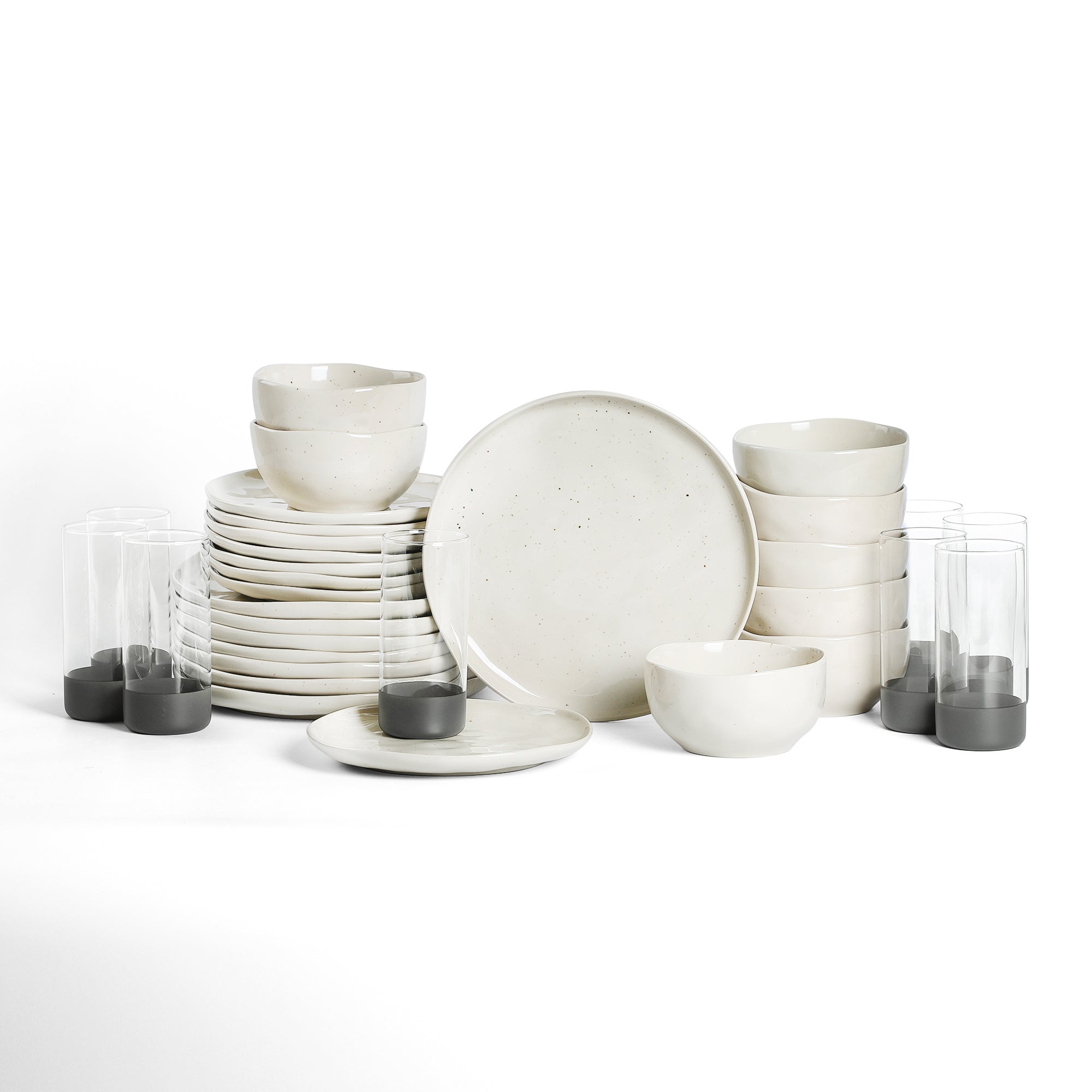 The dinnerware set is a curated assortment of ceramic plates, bowls, and glass tumblers, all designed for dining purposes. The ceramic components (plates and bowls) are made of ceramic/porcelain, offering durability and ease of cleaning, typical of fine dinnerware. The glass tumblers are constructed from clear glass with a dark gray (matte finish) base, likely a composite material like plastic or rubber, providing contrast and stability.