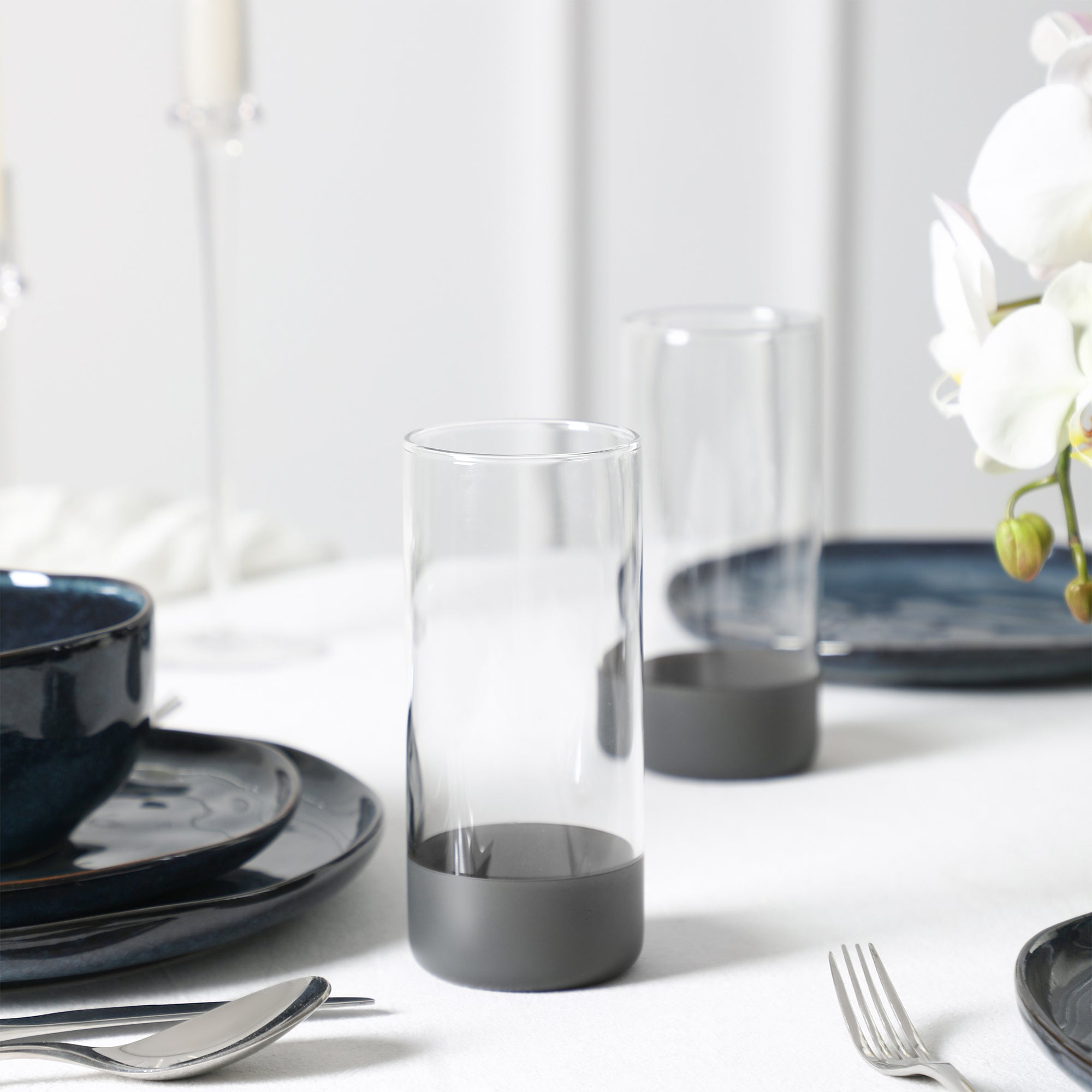 | Material (Glass Tumblers) | Clear glass with dark gray (matte finish) base |