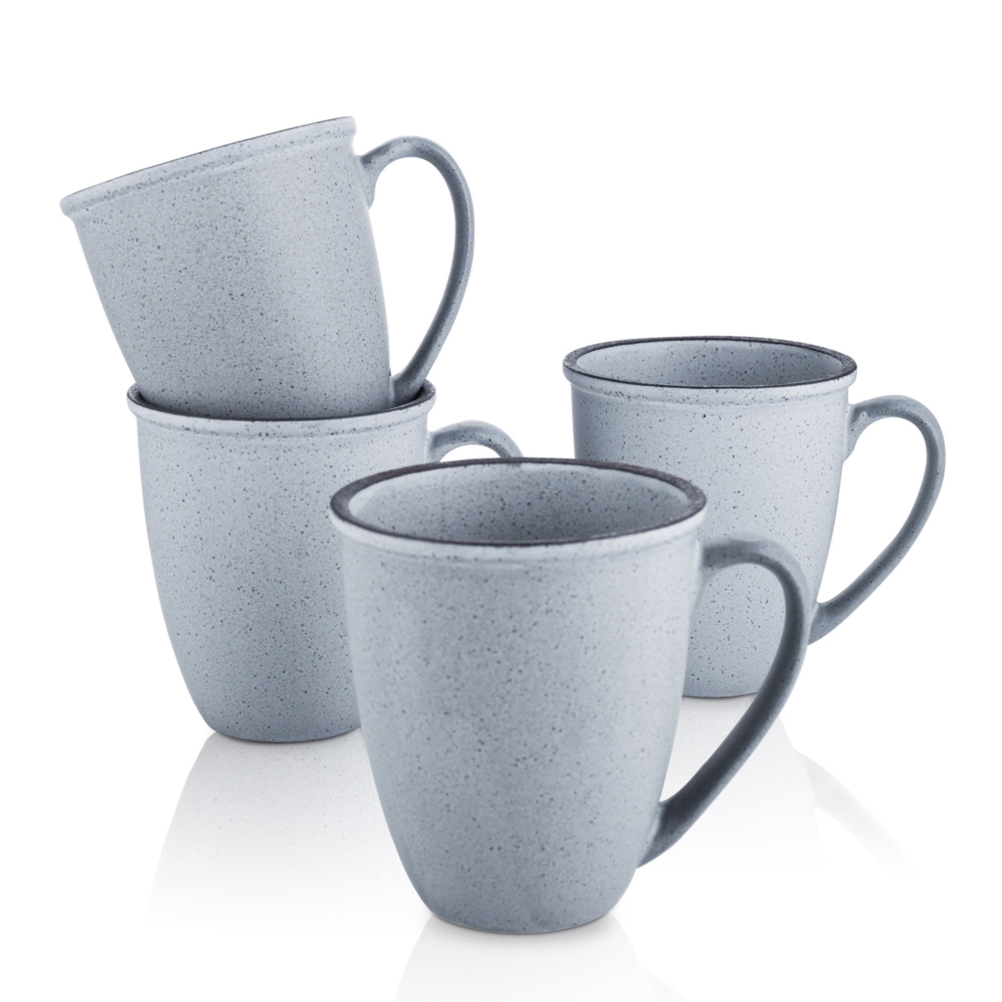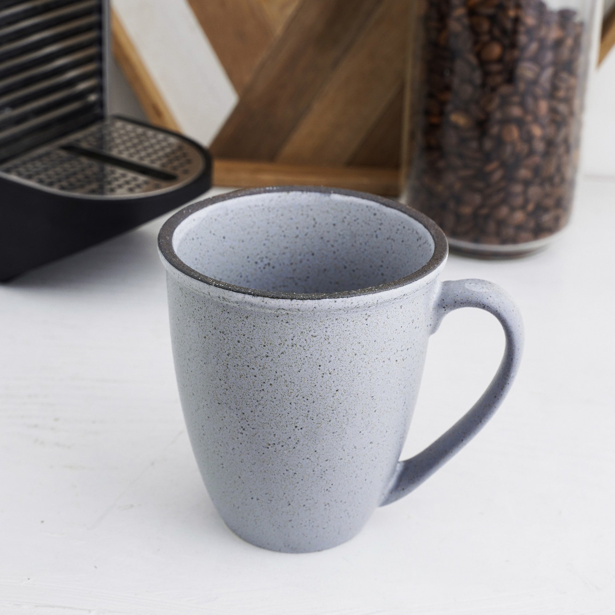 Crafted from high – quality ceramic or stoneware, these mugs feature a smooth, slightly textured finish with a subtle, rustic glaze. The primary color is a light gray or blue – gray, transitioning slightly from top to bottom. Small, evenly distributed dark specks create an artisanal, speckled effect, and a dark gray/black rim on the inside and outside of the top edge adds contrast and defines the opening.