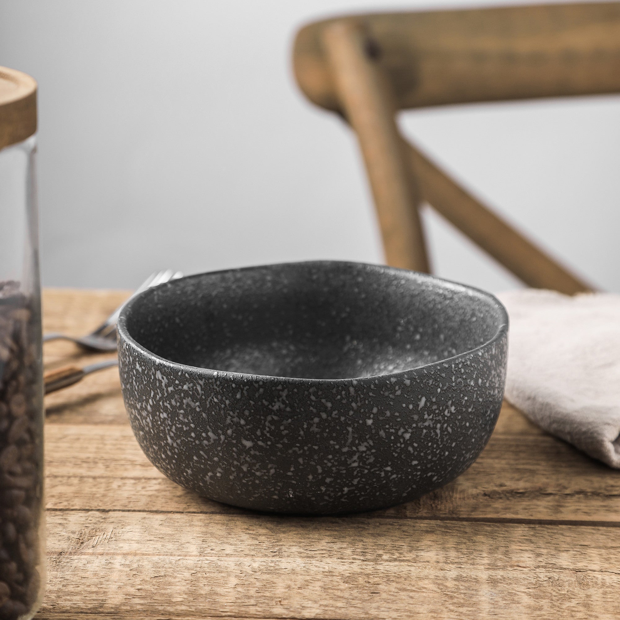 | Color & Design | Dark gray/black with white/light gray speckles; rounded, shallow bowl with slightly irregular rim; rough exterior texture, smooth interior |