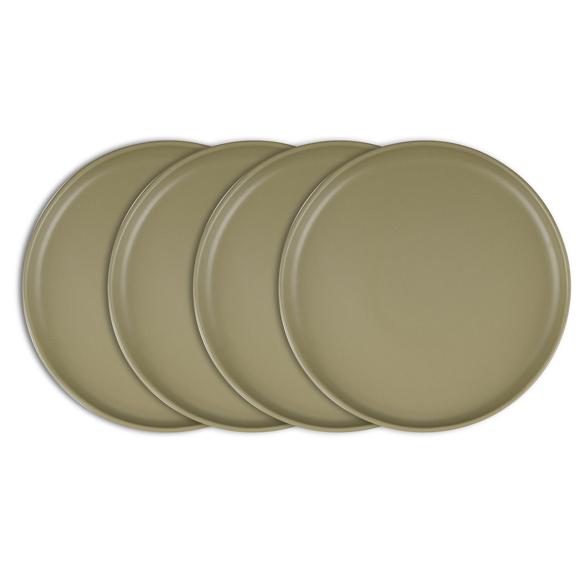 The set consists of 4 round, flat dishware plates, crafted from high – quality ceramic or porcelain. The smooth, matte finish not only gives them a tactile and understated aesthetic but also makes them resistant to fingerprints and scratches, perfect for regular use. The muted olive – green color, a solid earthy tone, adds a touch of nature to your table setting and is consistent across all plates, ensuring a cohesive look.