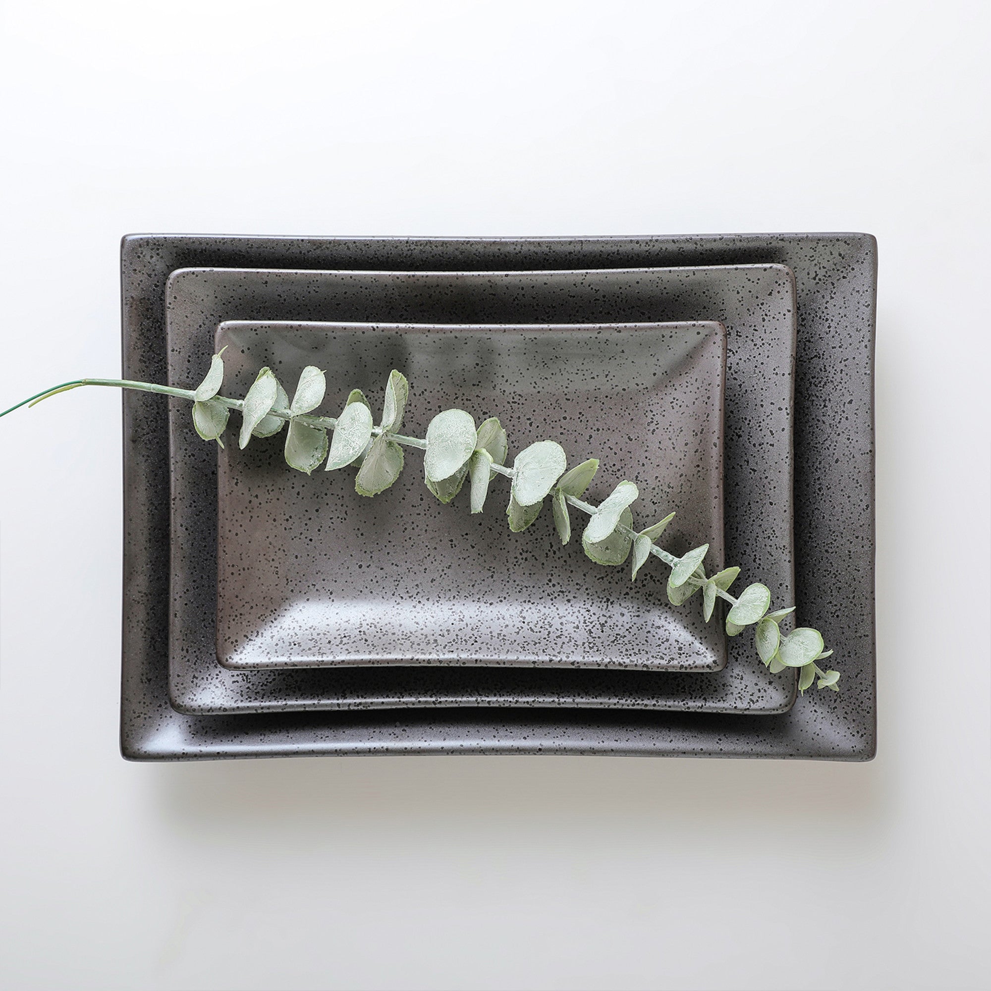 The set consists of rectangular (square – edged) ceramic plates, perfect for serving a variety of dishes. Made from high – quality ceramic or stoneware, these plates have a smooth, sturdy appearance with a semi – matte or matte glazed finish. The intentional decorative glaze application, featuring small, uniform black speckles on a dark gray (or charcoal) background, creates a minimalist yet visually interesting pattern that complements the contemporary, soft – edged design with rounded corners.
