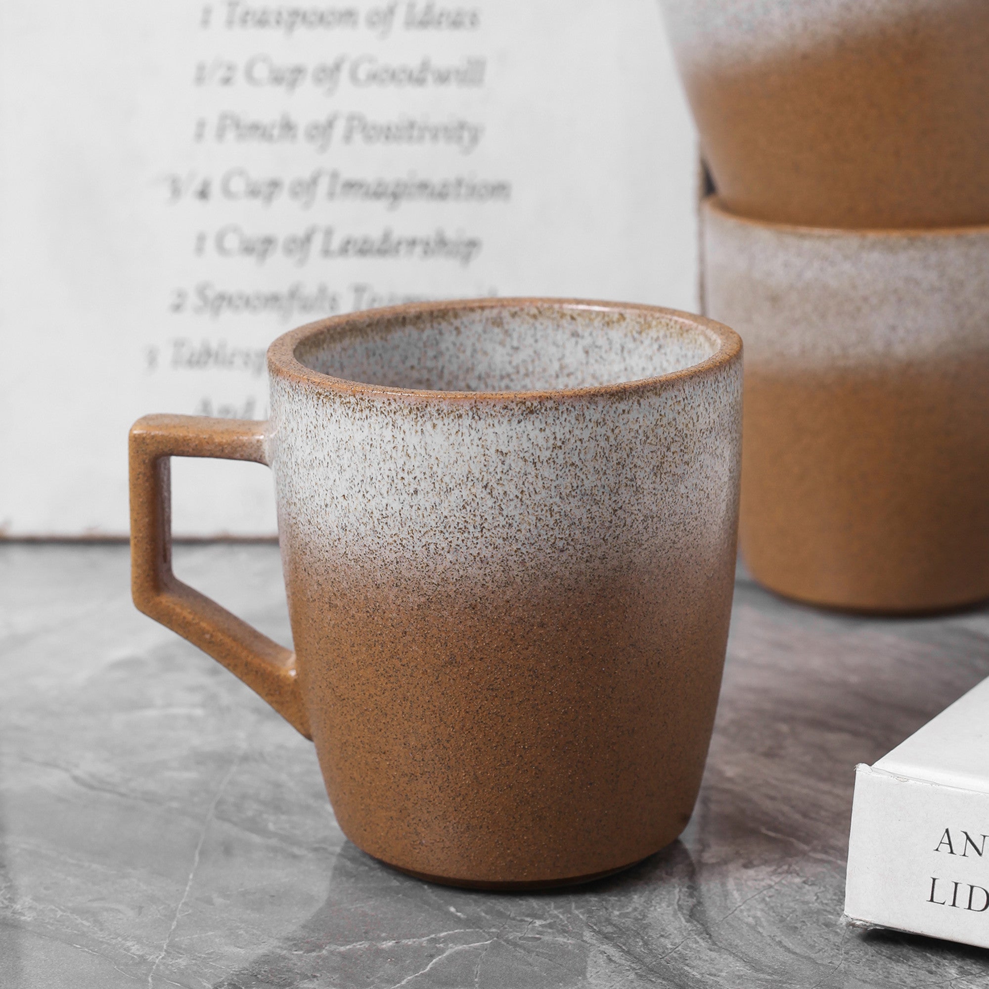 | Color & Design | Primary colors: Warm, earthy brown transitioning to white/light gray via gradient/ombre effect. Patterns/Textures: Speckled interior and exterior. Visual Elements: Uniform color transition, smooth glaze, and consistent speckling. |