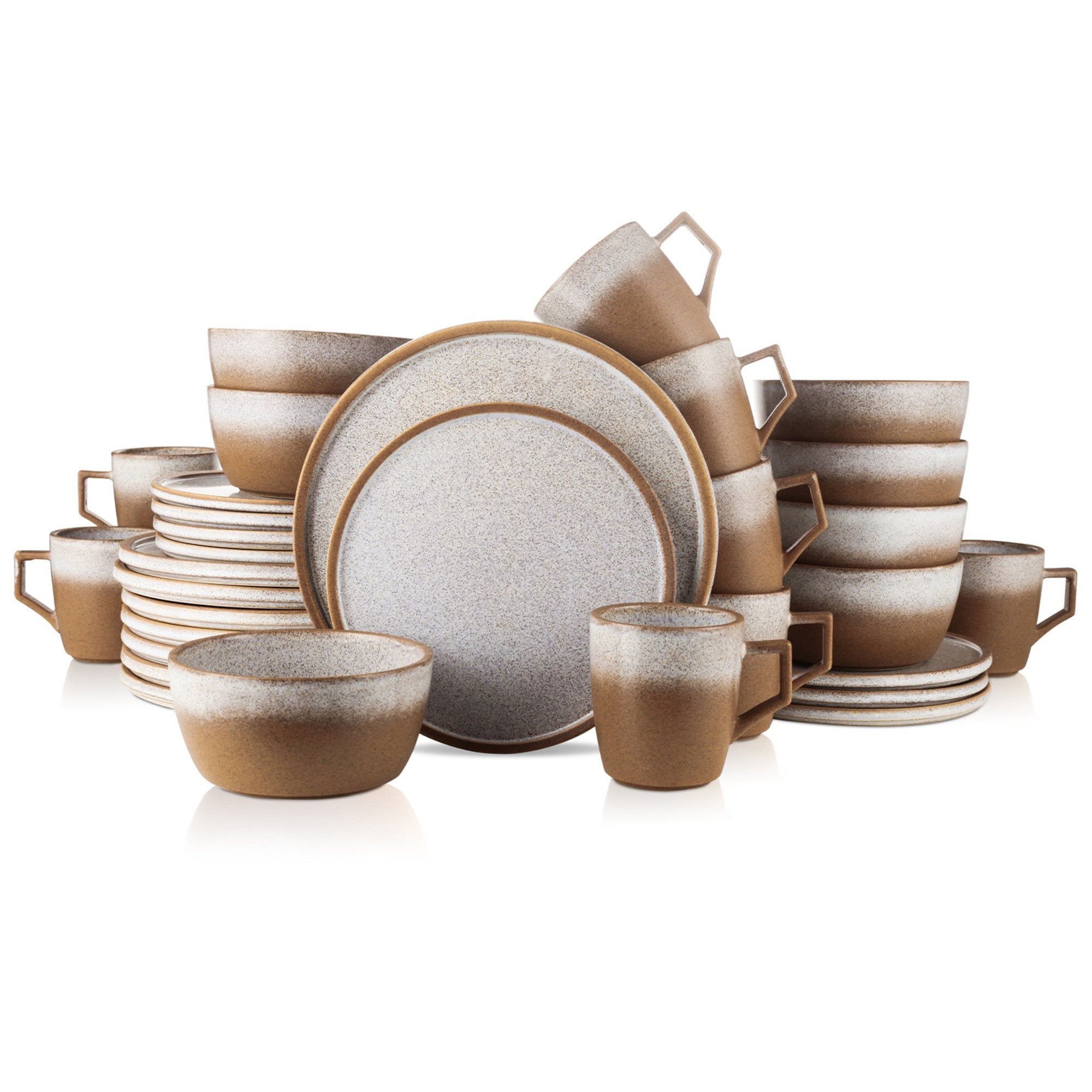 Each piece in the set is unique, as no two are exactly alike, adding to its charm. The warm, earthy brown color at the bottom transitions to white/light gray at the top via a gradient/ombre effect on bowls and mugs, while the plates have a speckled texture that adds visual interest. This design not only fits well into any traditional, minimal, French, or modern home or apartment but also complements rustic, farmhouse – style dining aesthetics.