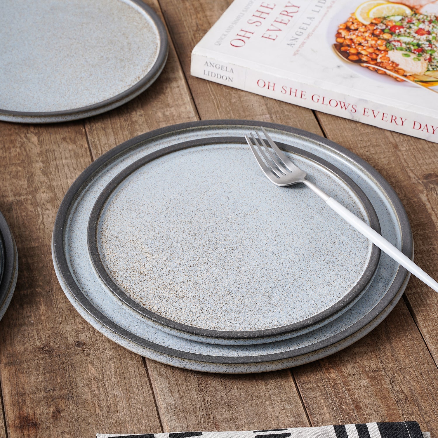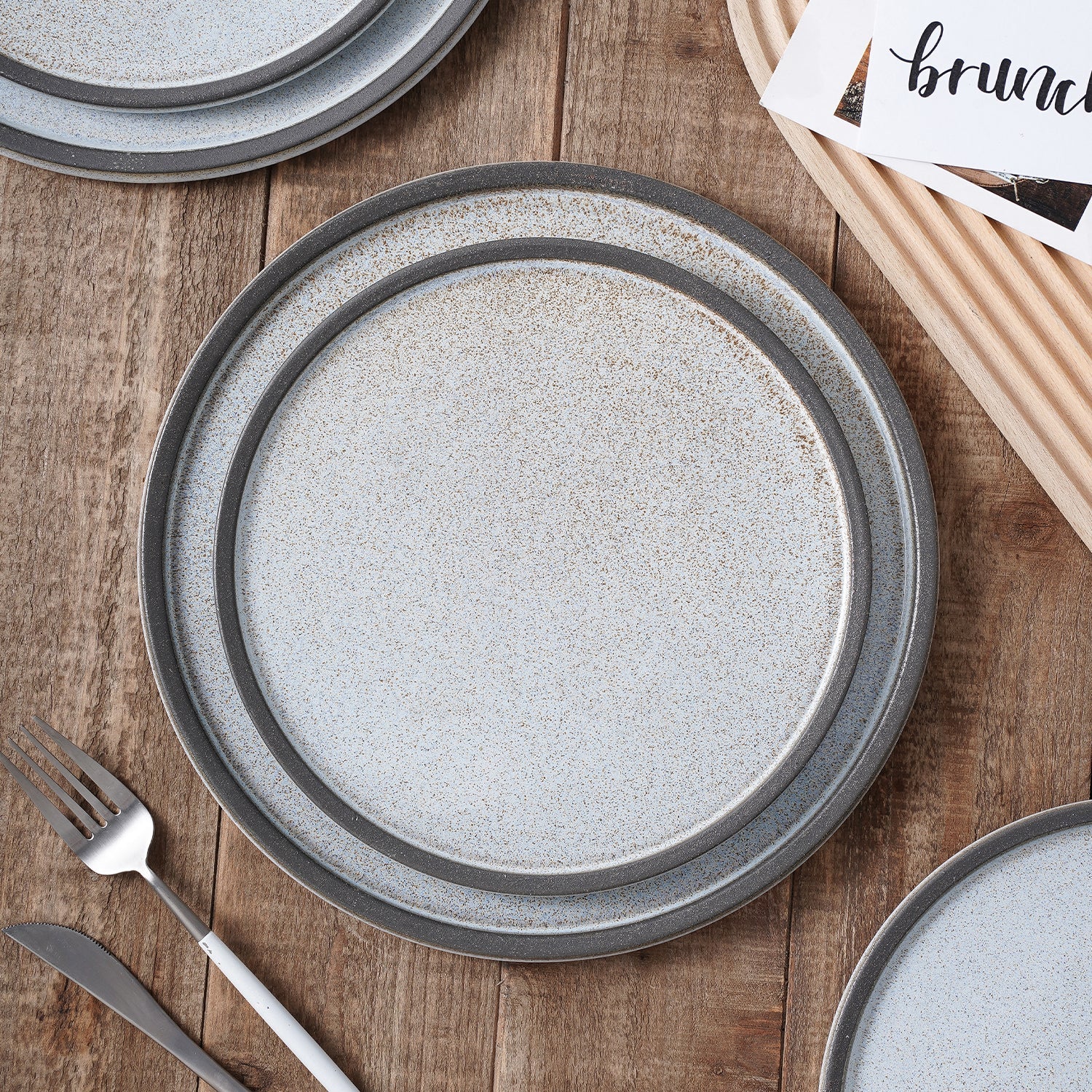 The standout feature of this set is its unique color and design. It showcases a gradient of gray – brown to light gray/white with a beautiful speckled (marbled) pattern. The gradient glaze transitions from a dark gray/brown at the base to lighter, speckled tones at the top, adding a touch of elegance. The contrast rim on plates and bowls creates a polished, layered look, while the handcrafted, organic texture evokes a farmhouse or contemporary rustic style.