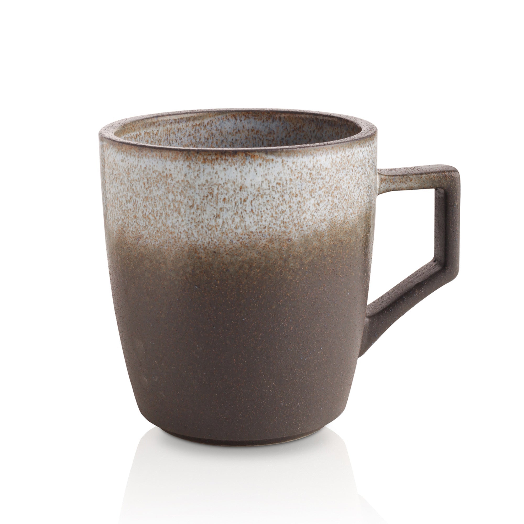 | Color & Design | Gradient ombre: lower half dark gray/charcoal brown, upper half light gray/ivory with brown speckles, blue – gray interior with speckles; square – shaped handle, mottled, speckled glaze, clean, minimalist silhouette |